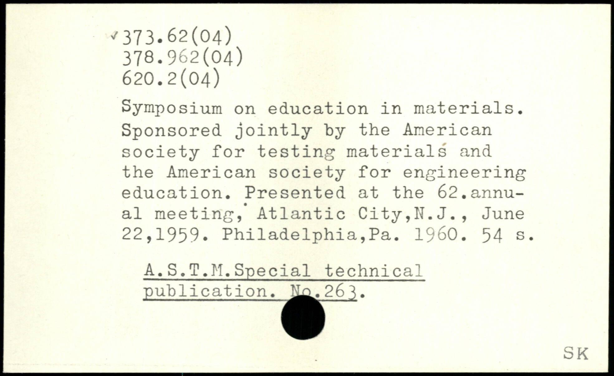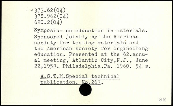 Symposium on education in materials. Sponsored jointly by the American society for testing materials and the American society for engineering education. Presented at the 62.annual meeting, Atlantic City,N.J., June 22,1959. Philadelphia,Pa. 1960.
