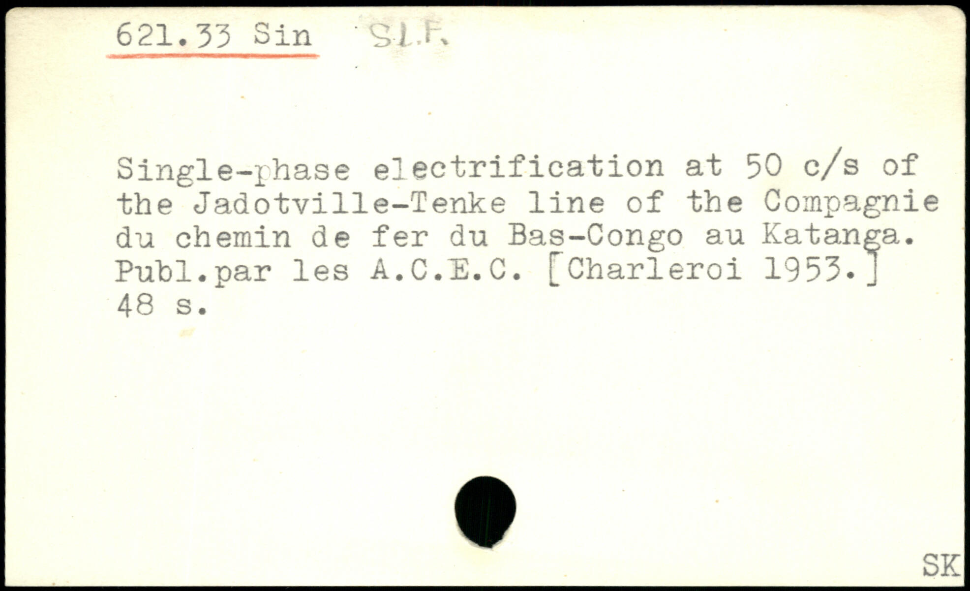 Single-phase electrification at 50 c/s of the Jadotville-Tenke line of the Compagnie du chemin de fer du Bas-Congo au Katanga. Publ.par les A.C.E.C. [Charleroi 1953. J