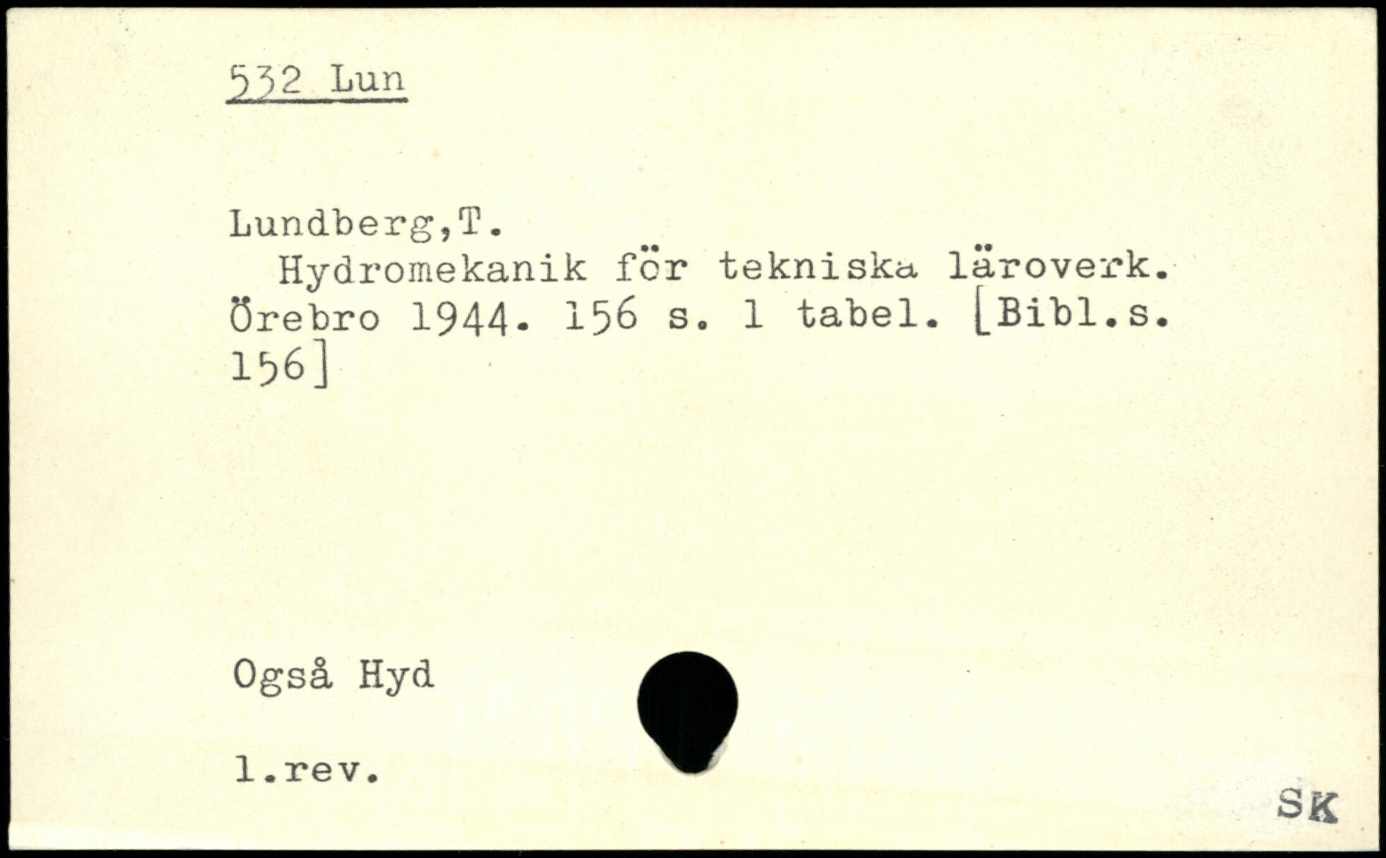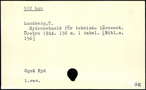 Hydromekanik för tekniska, läroverk. Örebro 1944, 15^ s. 1 tabel. j_Bibl.s. 156] Også Hyd l.rev.