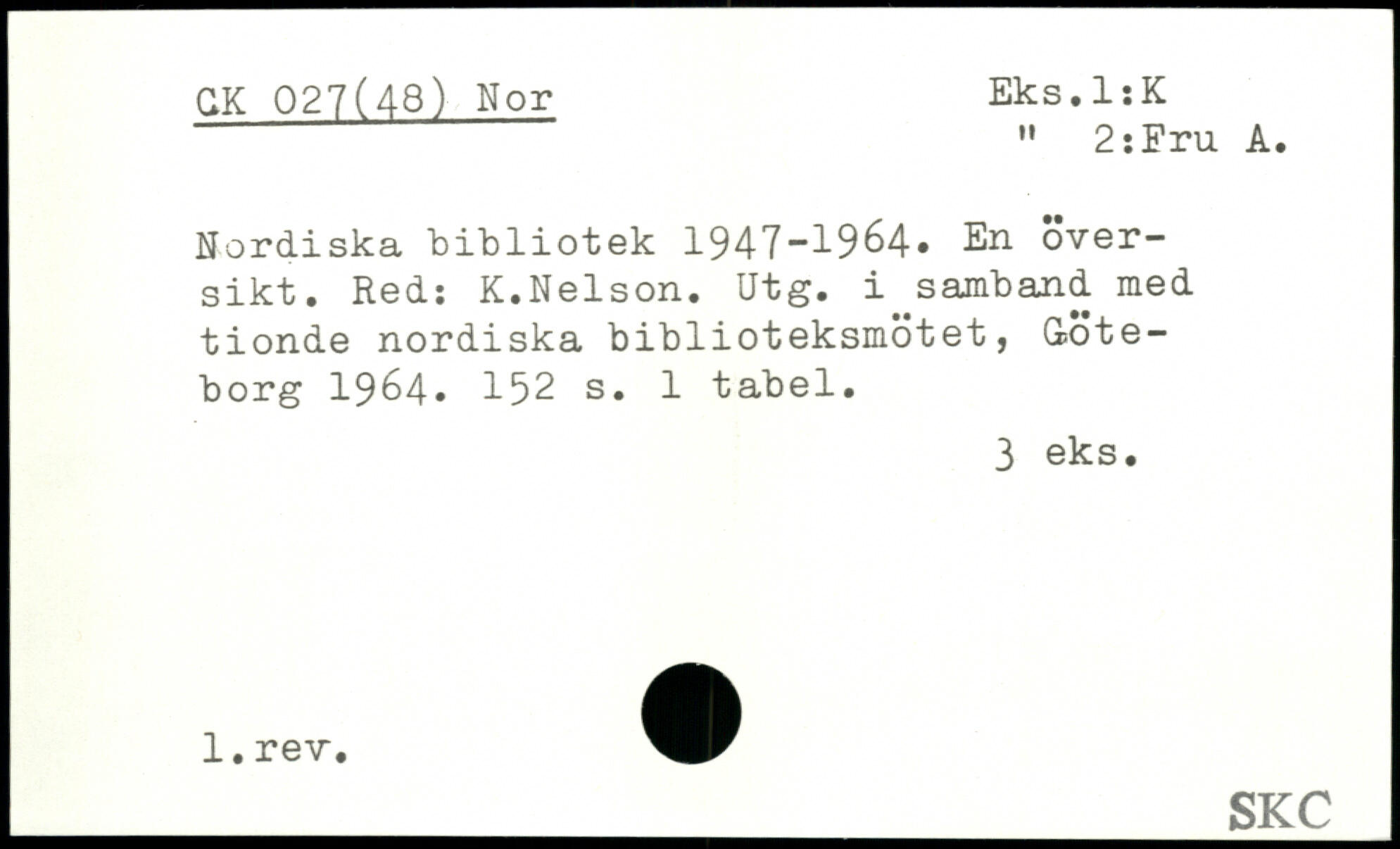 Nordiska bibliotek 1947-1964. En översikt. Red: K.Nelson. Utg. i samband med tionde nordiska biblioteksmotet, Göteborg 1964.