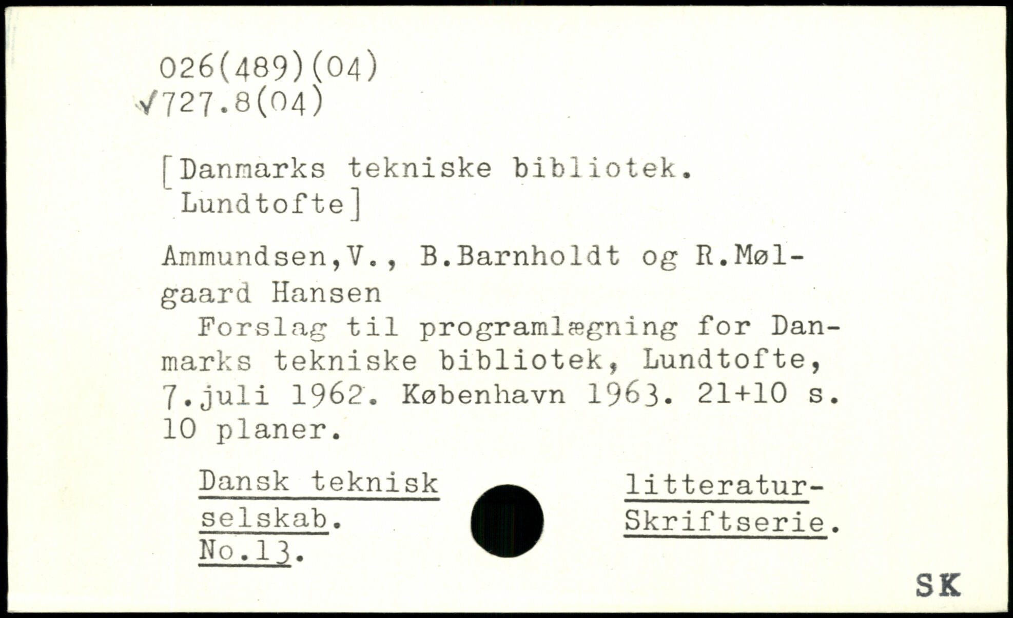 [Danmarks tekniske bibliotek. Lundtofte] Ammundsen,V., B.Barnholdt og R.Møl-gaard Hansen Forslag til programlægning for Danmarks tekniske bibliotek, Lundtofte, 7.juli 1962.