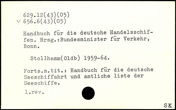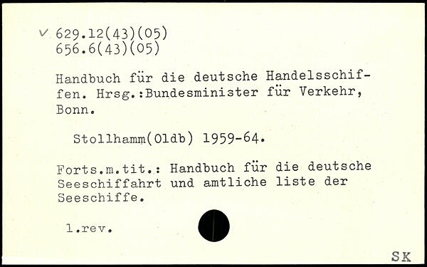 Handbuch für die deutsche Handelsschiffen. Hrsg.:Bundesminister für Verkehr, Bonn. Stollhamm(Oldb) 1959-64, Forts.m.tit.: Handbuch für die deutsche Seeschiffahrt und amtliche liste der Seeschiffe.