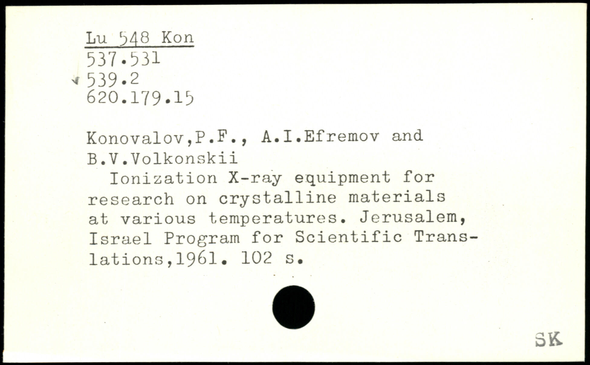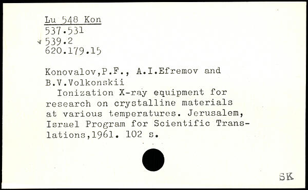 Ionization X-ray equipment for research on crystalline materials at various temperatures. Jerusalem, Israel Program for Scientific Translations ,1961.