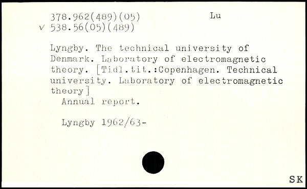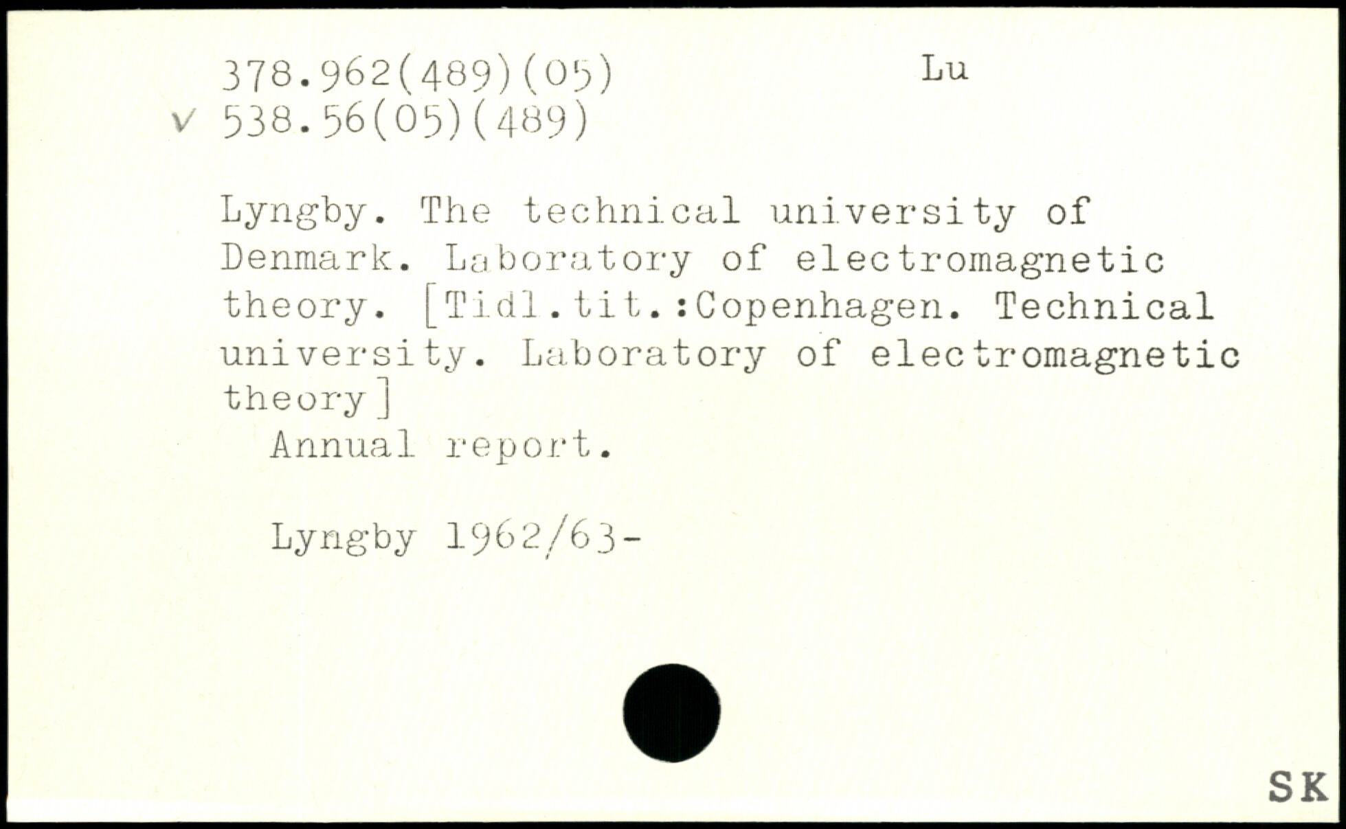 Lyngby. The technical university of Denmark. Laboratory of electromagnetic theory. [Tidl.titCopenhagen. Technical university. Laboratory of electromagnetic theory] Annual report. Lyngby 1962/63-