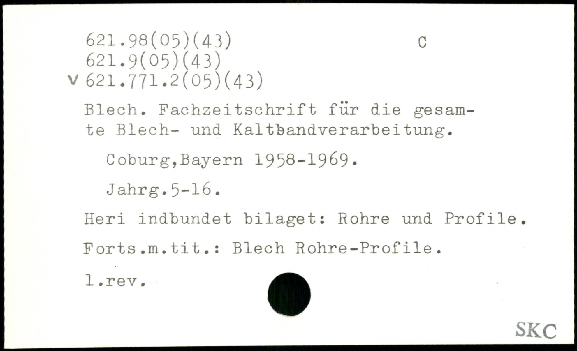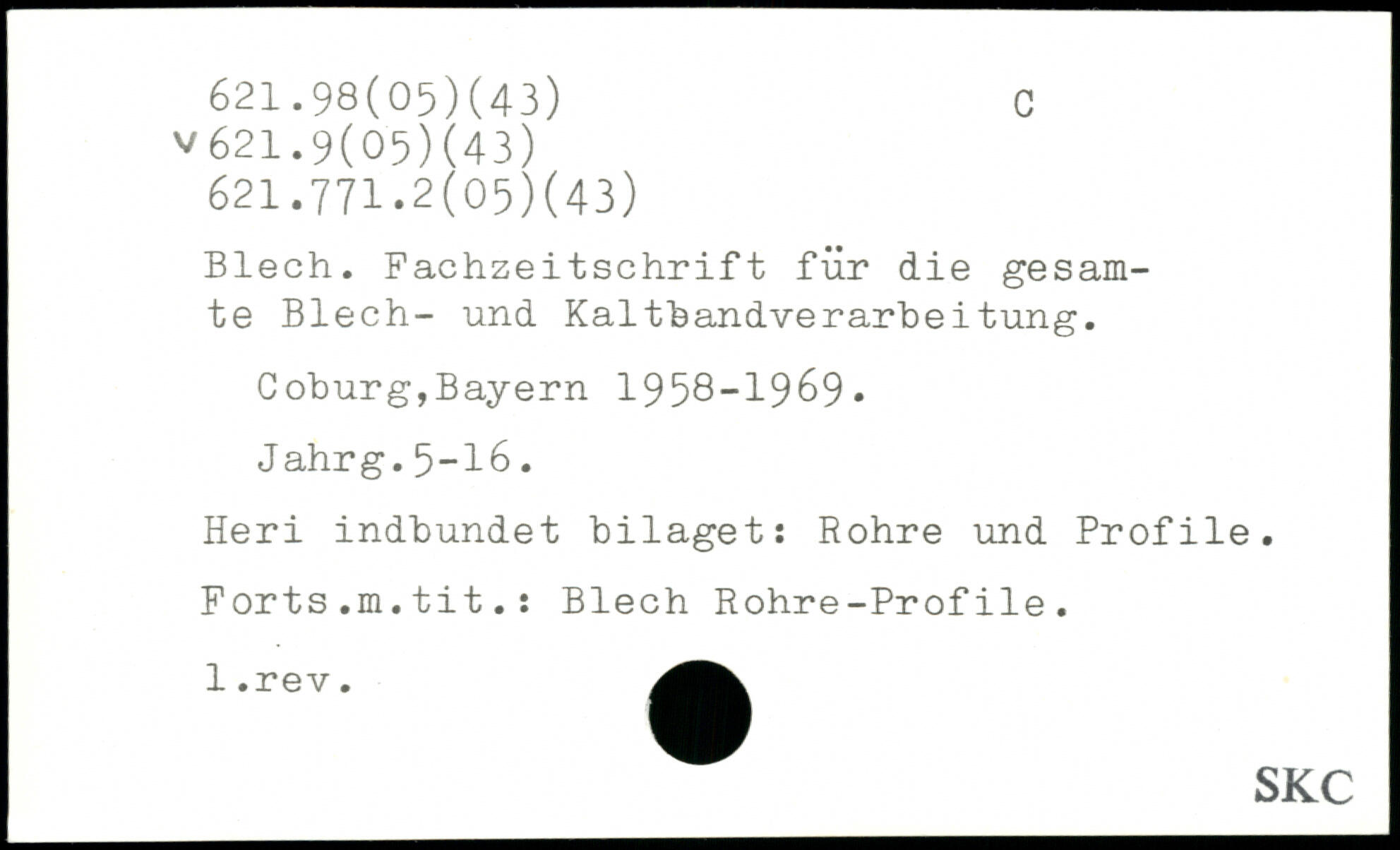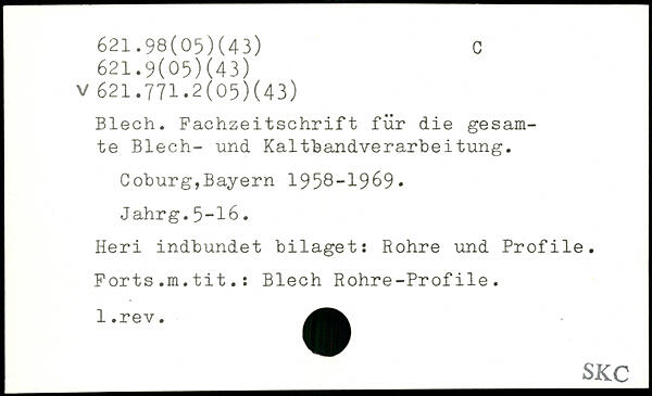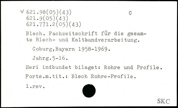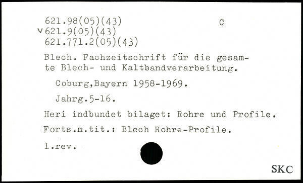 Blech. Fachzeitschrift für die gesamte Blech- und Kaltbandverarbeitung. Coburg,Bayern 1958-1969. J ahrg.5-16. Heri indbundet bilaget: Rohre und Profile. Forts.m.tit.: Blech Rohre-Profile.