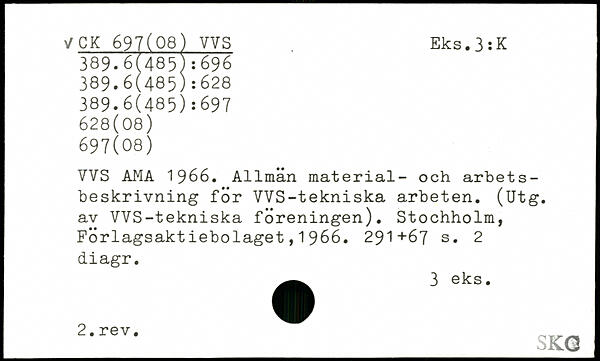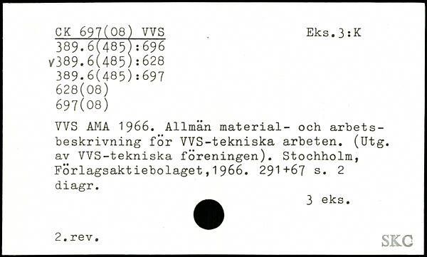 VVS AMA 1966. Allmän material- och arbetsbeskrivning för VVS-tekniska arbeten. (Utg. av VVS-tekniska föreningen). Stochholm, Förlagsaktiebolaget, 1 966.