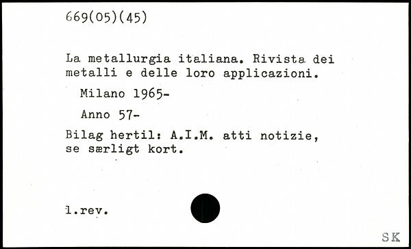 La metallurgia italiana. Rivista. dei metalli e delle loro applicazioni. Milano 1965- Anno 57- Bilag hertil: A.I.M. atti notizie, se særligt kort.