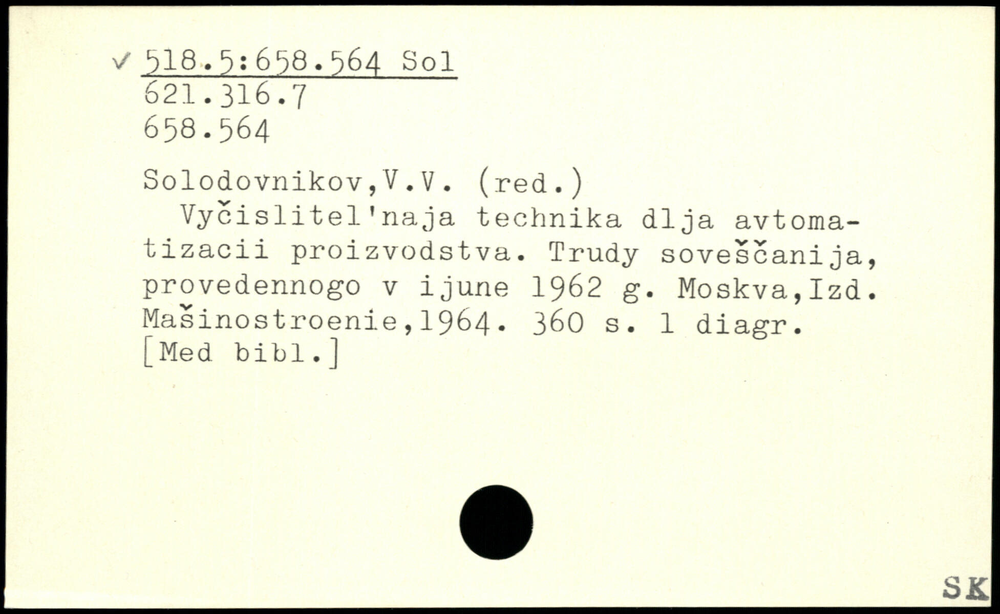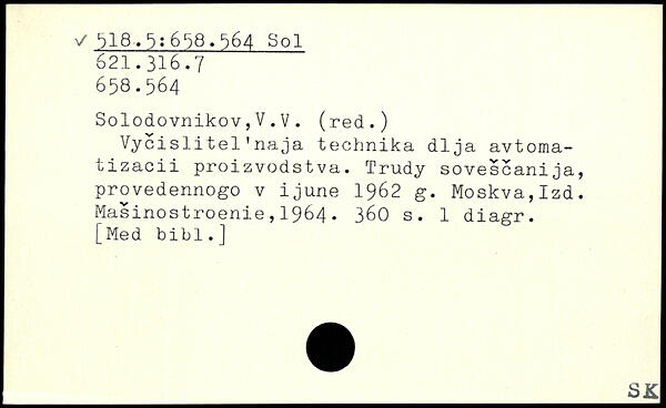 Vycislitel'naja technika dlja avtoma-tizacii proizvodstva. Trudy sovescanija, provedennogo v ijune 1962 g. Moskva,Izd. Masinostroenie,1964. 36O s. 1 diagr.
