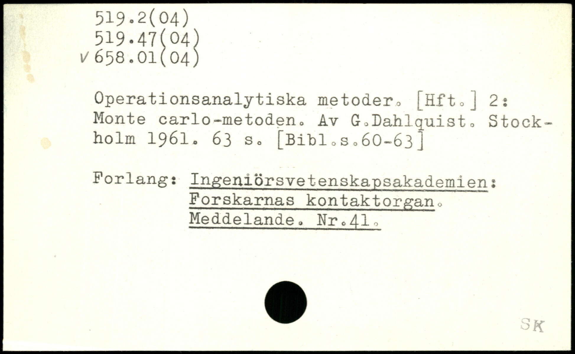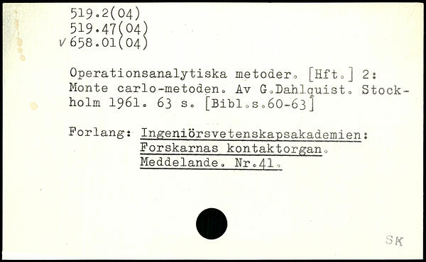 Operationsanalytiska metoder0 [Hft.] 2: Monte earl o-metoden .> Av GoDahlquist.