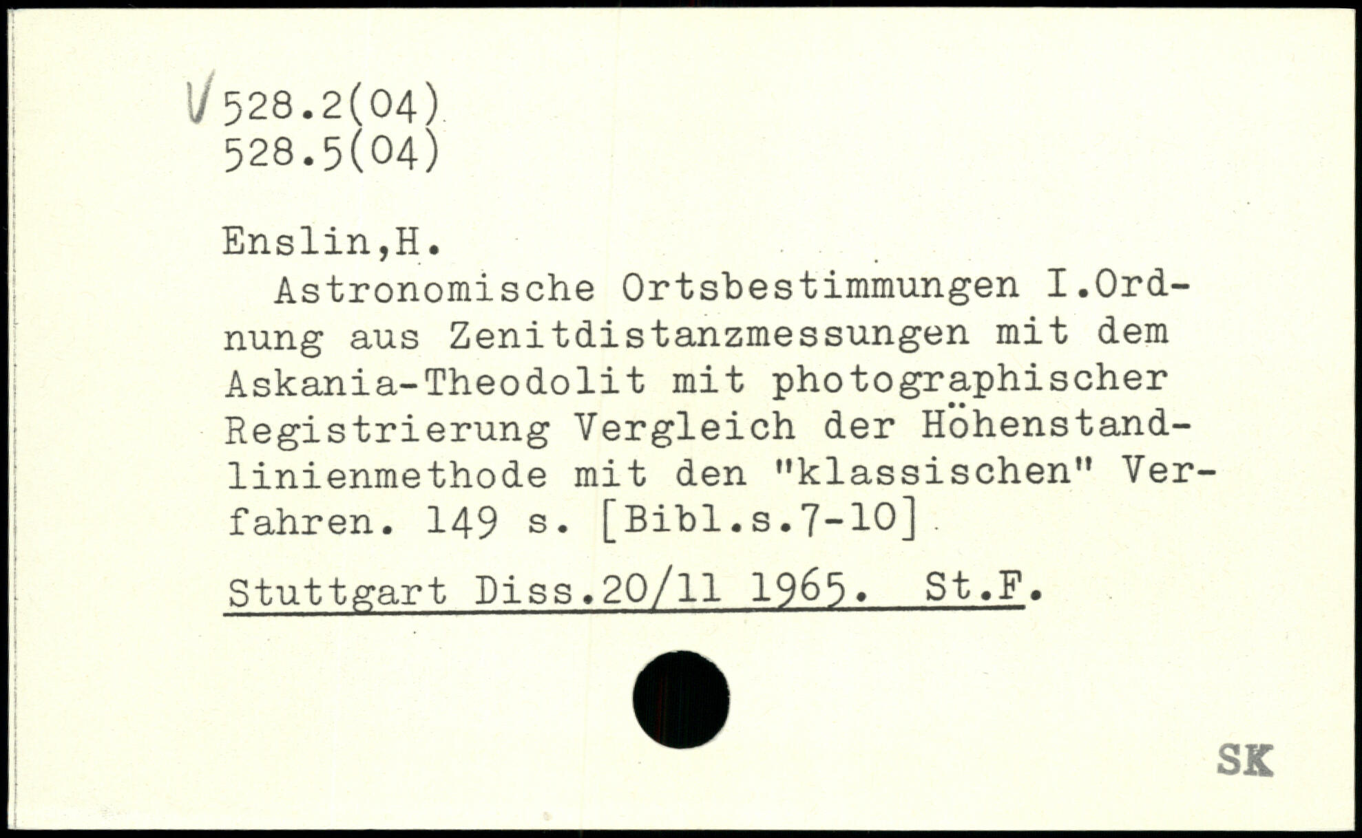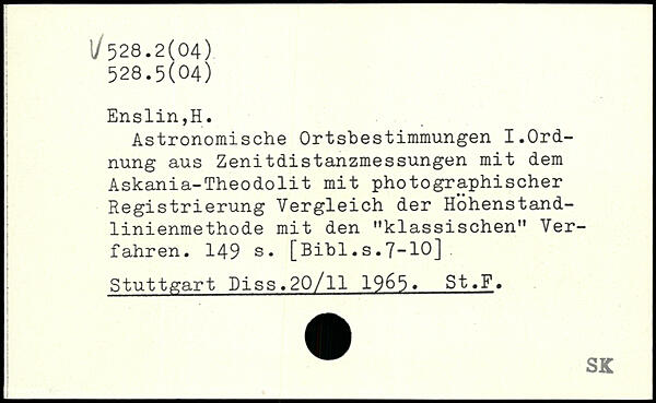 Astronomische Ortsbestimmungen I.Ordnung aus Zenitdistanzmessungen mit dem Askania-Theodolit mit photographischer Registrierung Vergleich der Hohenstand-linienmethode mit den "klassischen” Verfahren.