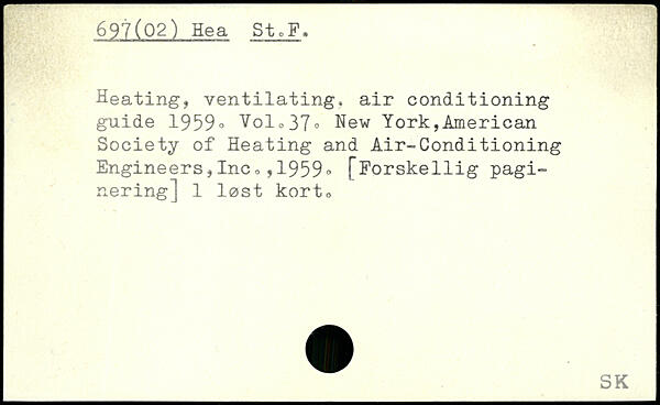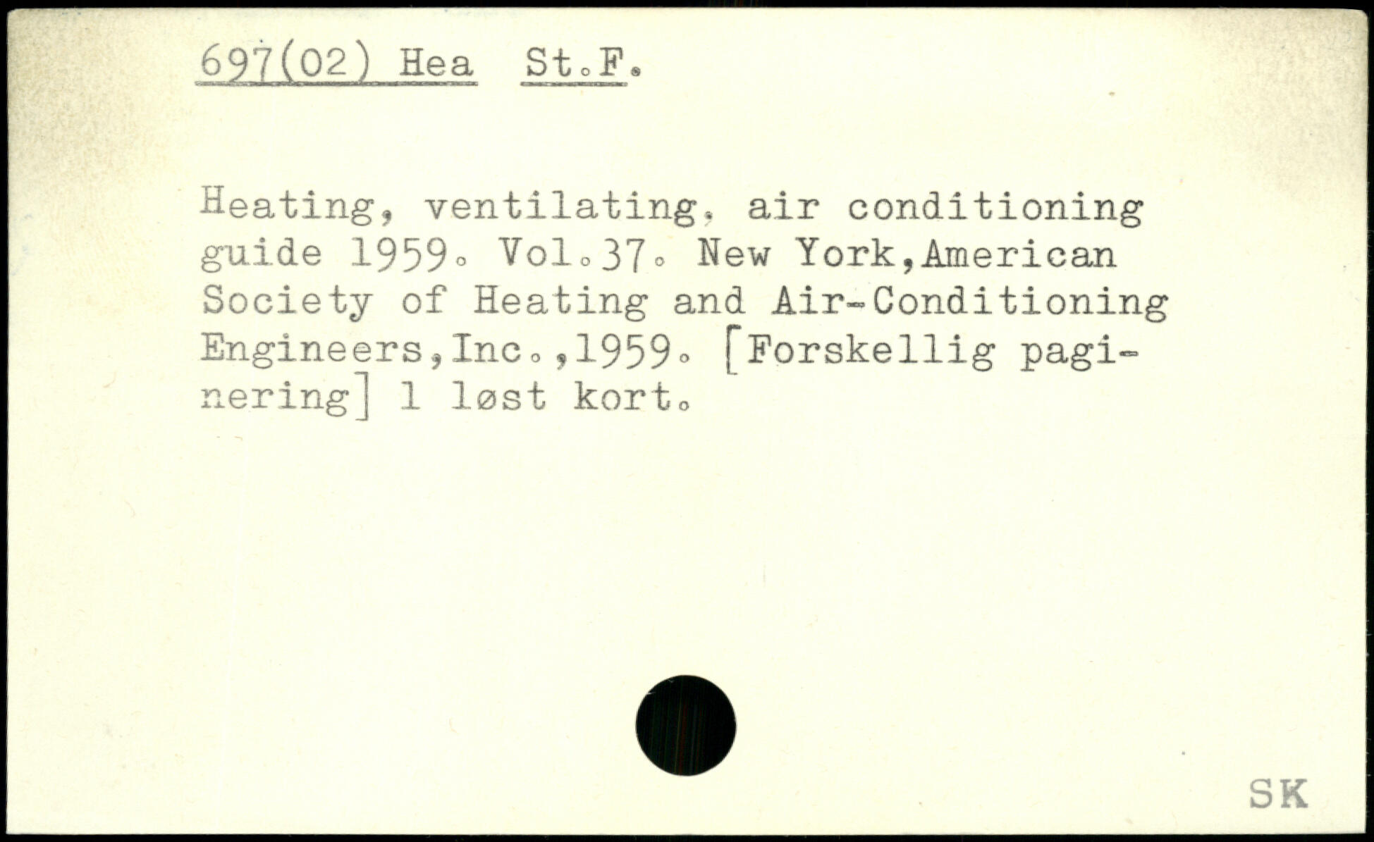Heating, ventilating, air conditioning guide 1959o Vo1037, New York,American Society of Heating and Air-Conditioning Engineers,Inc<> ,1959. [Forskellig pagi- nering] 1 lost kort