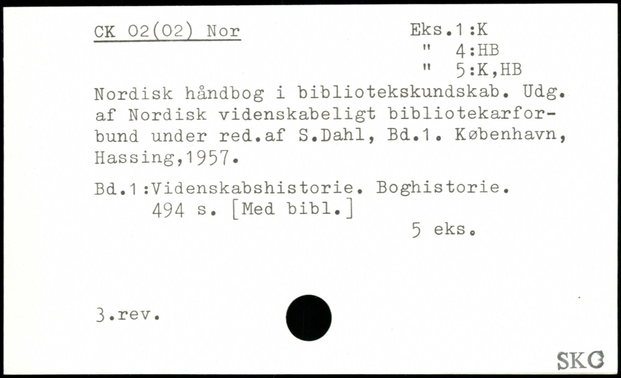 Nordisk håndbog i bibliotekskundskab. Udg. af Nordisk videnskabeligt bibliotekarforbund under red.af S.Dahl