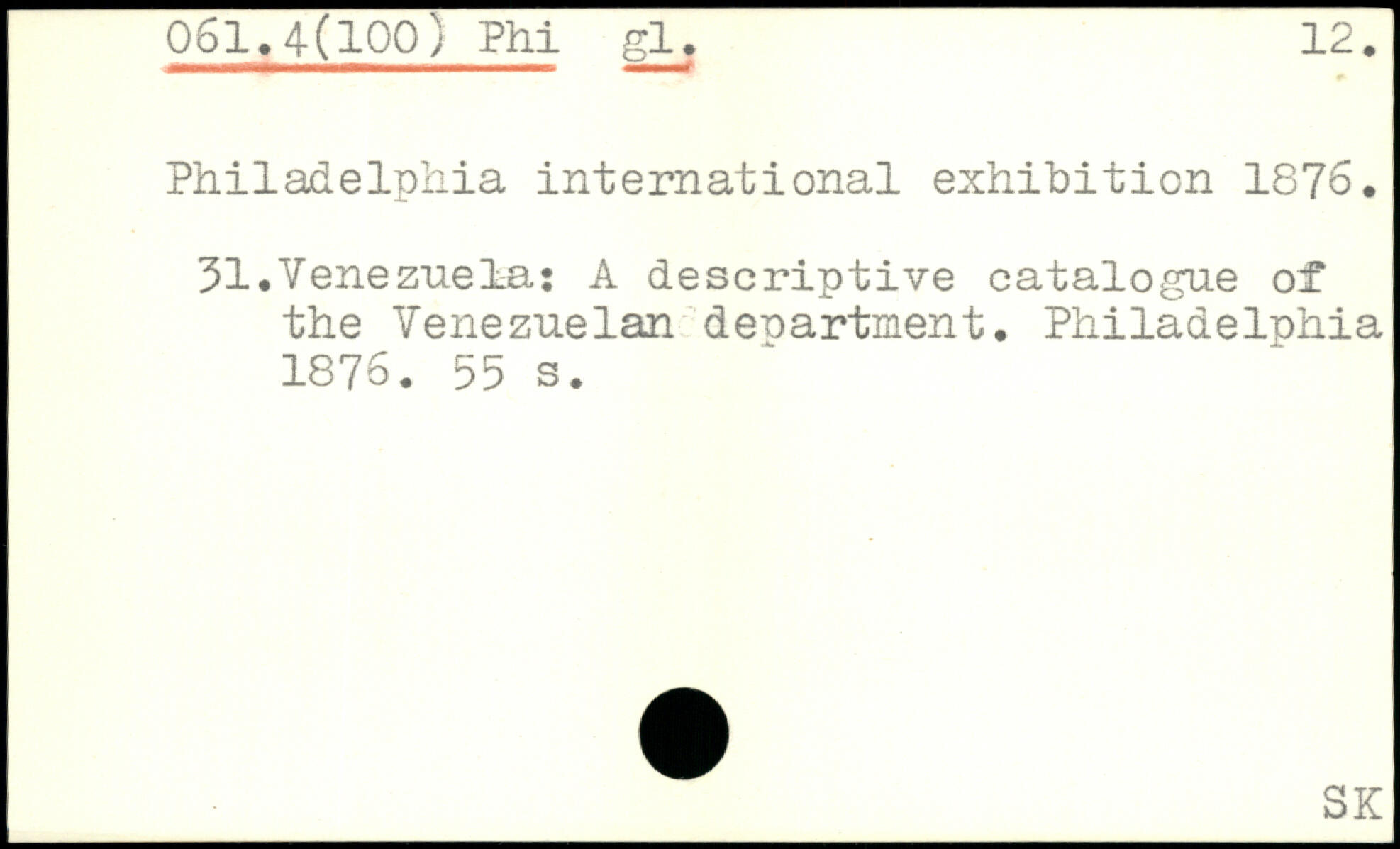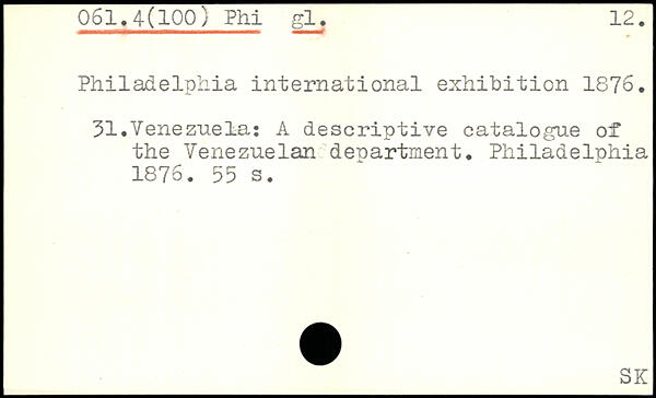 Philadelphia international exhibition 1876. 31.Venezuela; A descriptive catalogue of the Venezuelan department. Philadelphia 1876.