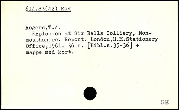 Explosion at Six Bells Colliery, Monmouthshire. Report. London,H.M.Stationery Office,1961.