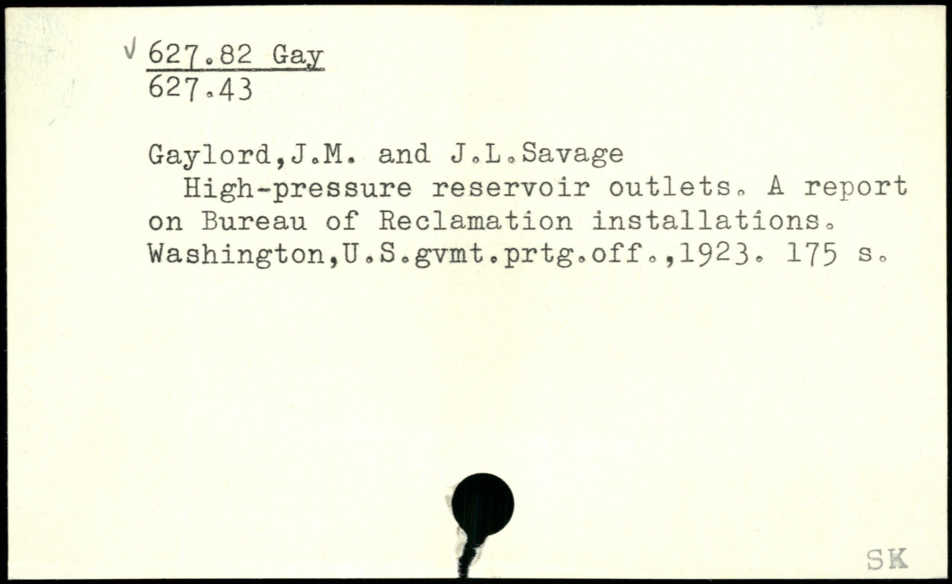 Gaylord,J,M. and J,L,Savage High-pressure reservoir outlets, A report on Bureau of Reclamation installations , Washington,Ü,Segvmt.prtg.off,,1923, 175 _9_SK