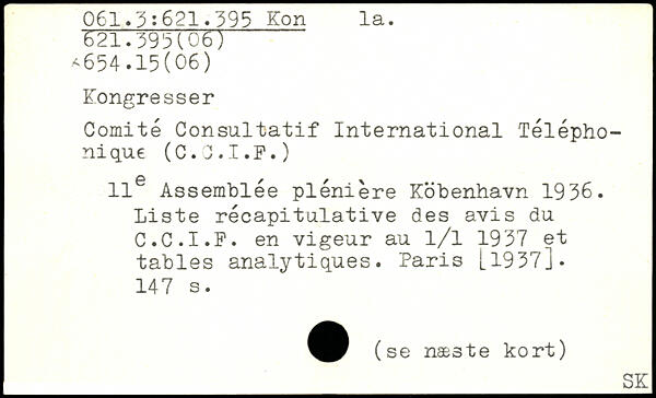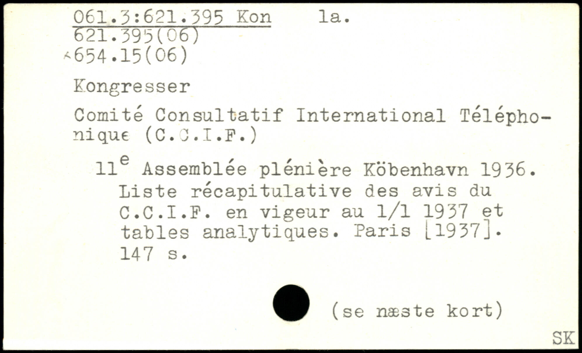 Comité Consultatif International Téléphonique (C.C.I.F.) 11e Assemblée plénière Kobenhavn 1936. Liste récapitulative des avis du C.C.I.F. en vigeur au l/l 1937 et tables analytiques.