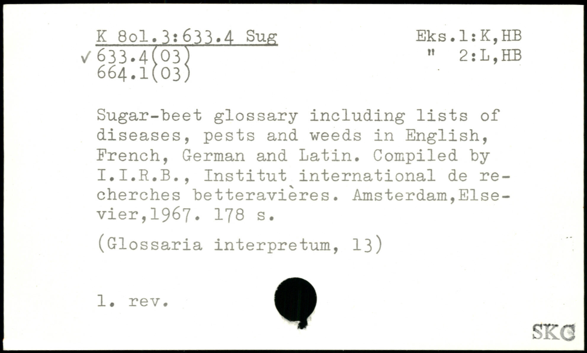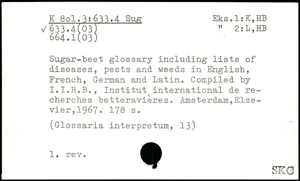 Sugar-beet glossary including lists of diseases, pests and weeds in English, French, German and Latin. Compiled by I.I.R.B., Institut international de recherches betteravières.