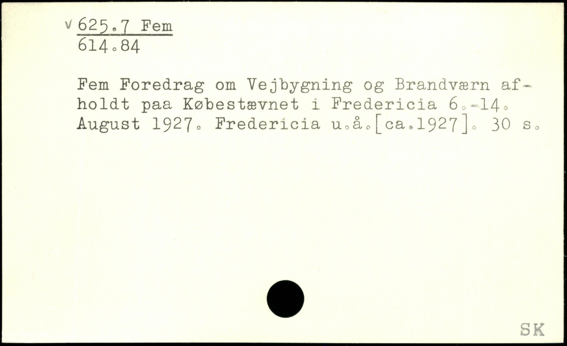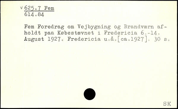 Fem Foredrag om Vejbygning og Brandværn afholdt paa Købestævnet i Fredericia 6<,-14o August 1927. Fredericia u,åc[ca,1927]o
