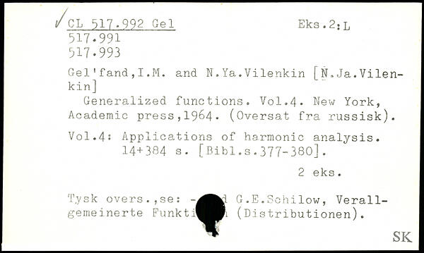 Gel'fand,I.M. and N.Ya.Vilenkin [N,Ja.Vilenkin] Generalized functions. V0I.4. New York, Academic press,19&4- (Oversat fra russisk).