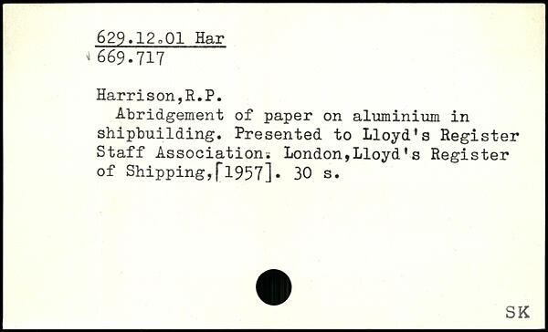 Abridgement of paper on aluminium in shipbuilding. Presented to Lloyd’s Register Staff Association; London,Lloyd’s Register of Shipping,f1957].