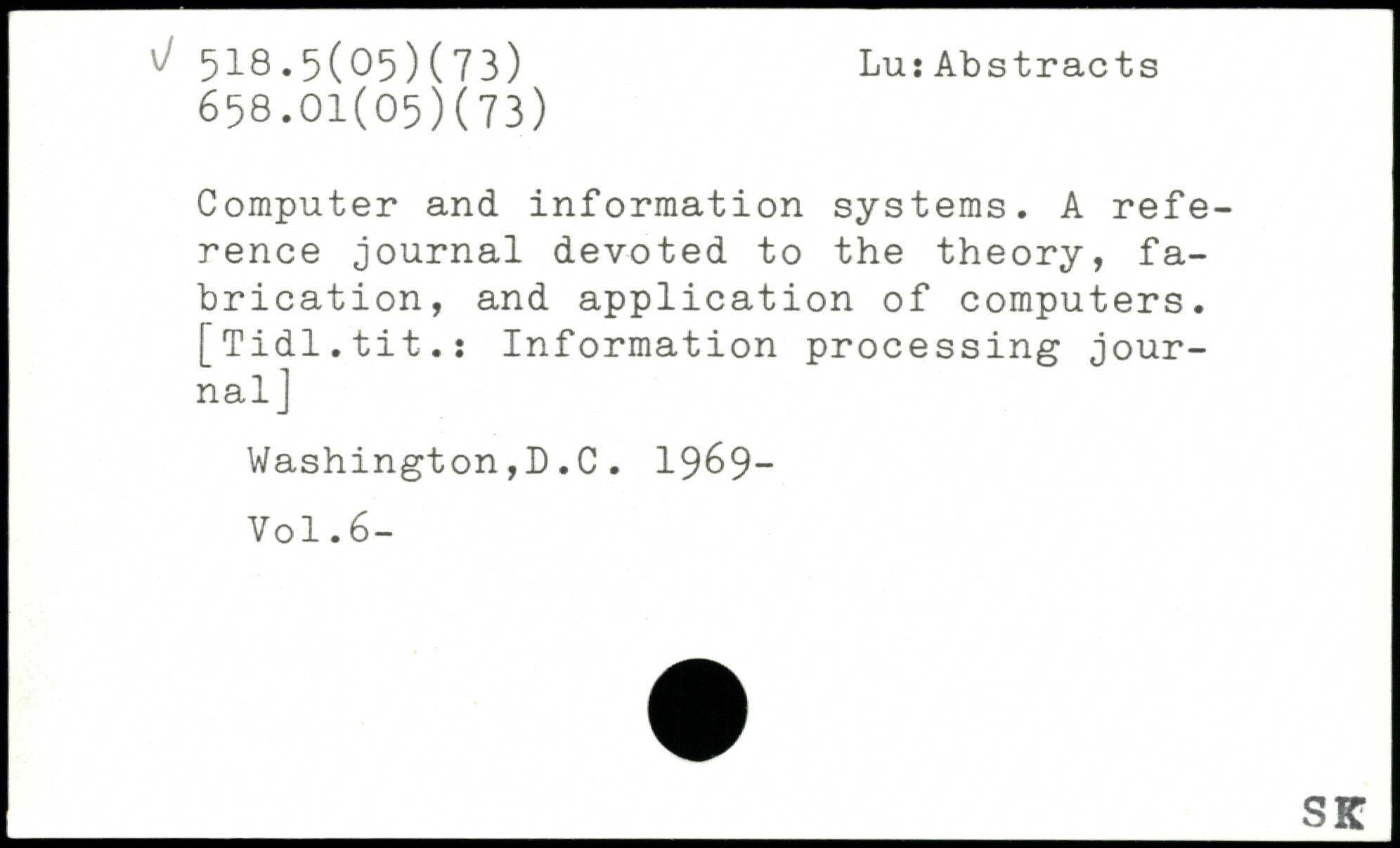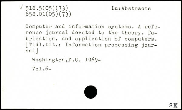 Computer and information systems. A reference journal devoted to the theory, fabrication, and application of computers. [Tidl.tit.: Information processing journal] Washington,D.C. 1969-