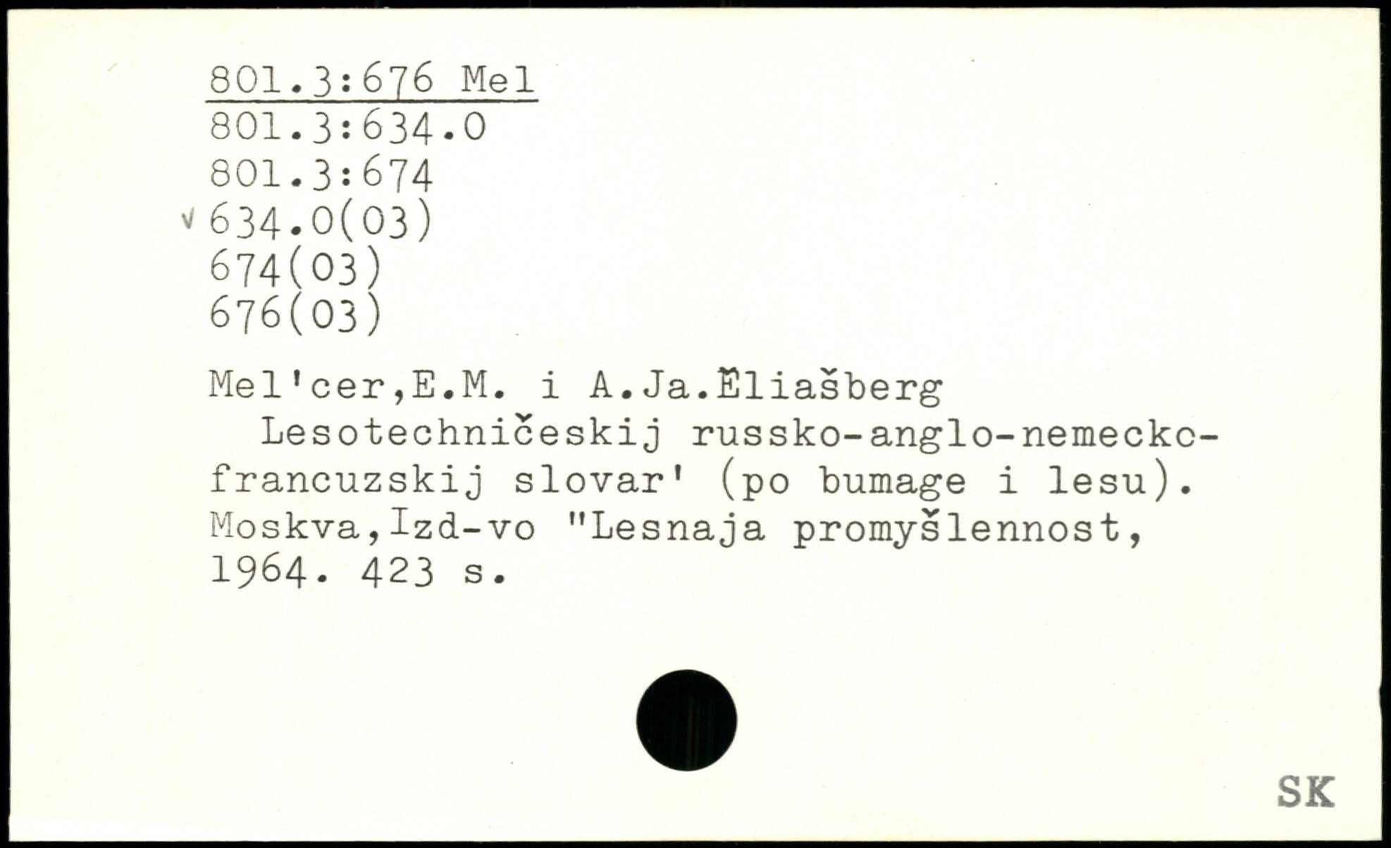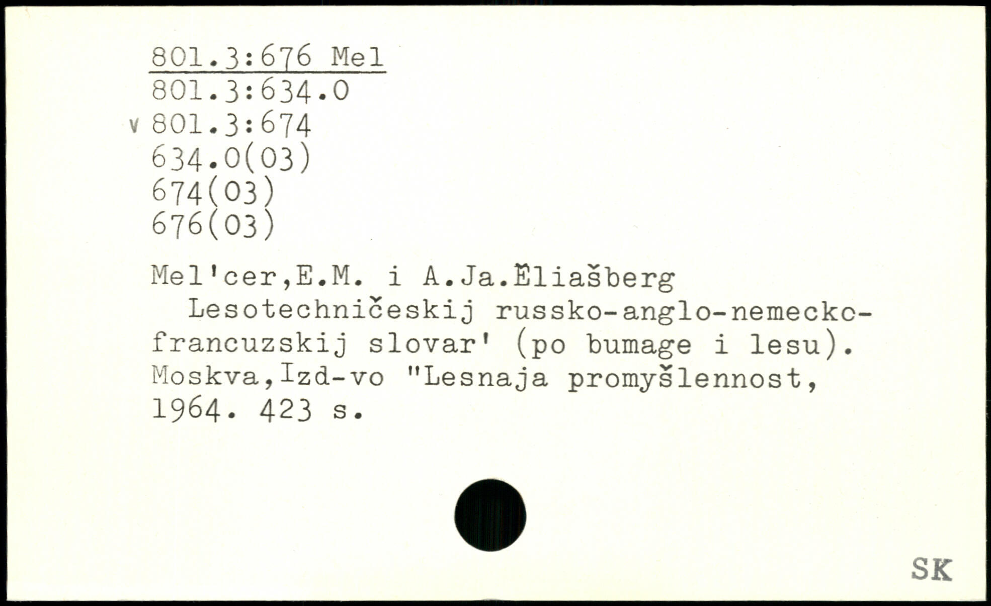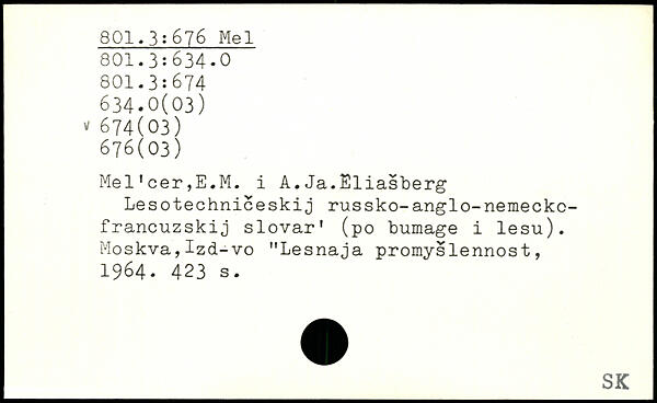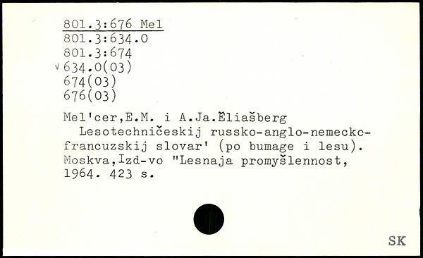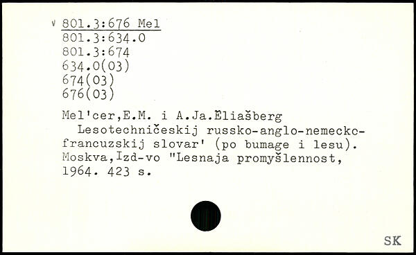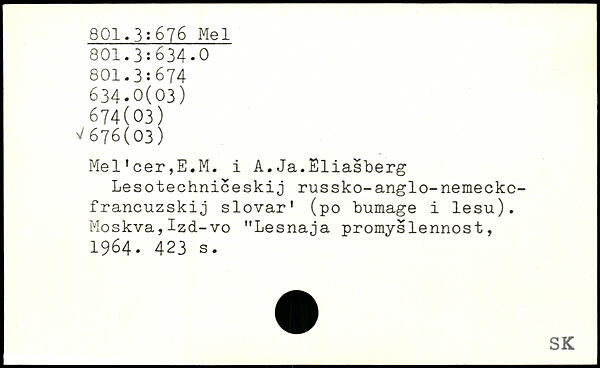 Mel'cer,E.M. i A.Ja.Eliasberg Lesotechniceskij russko-anglo-nemeckc-francuzskij slovar' (po bumage i lesu). Moskva,Izd-vo "Lesnaja promyslennost, 1964.