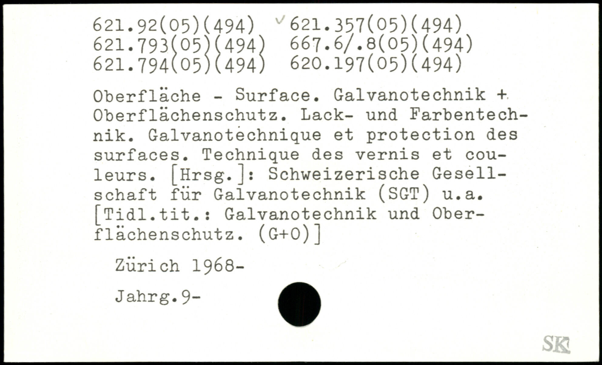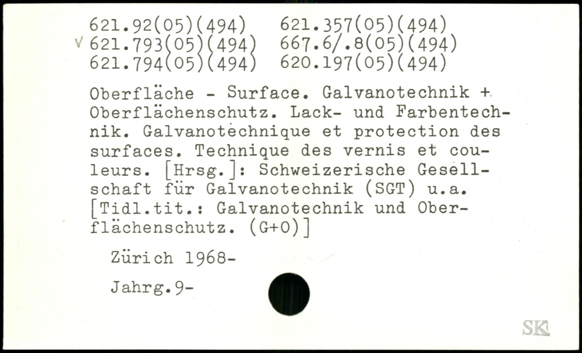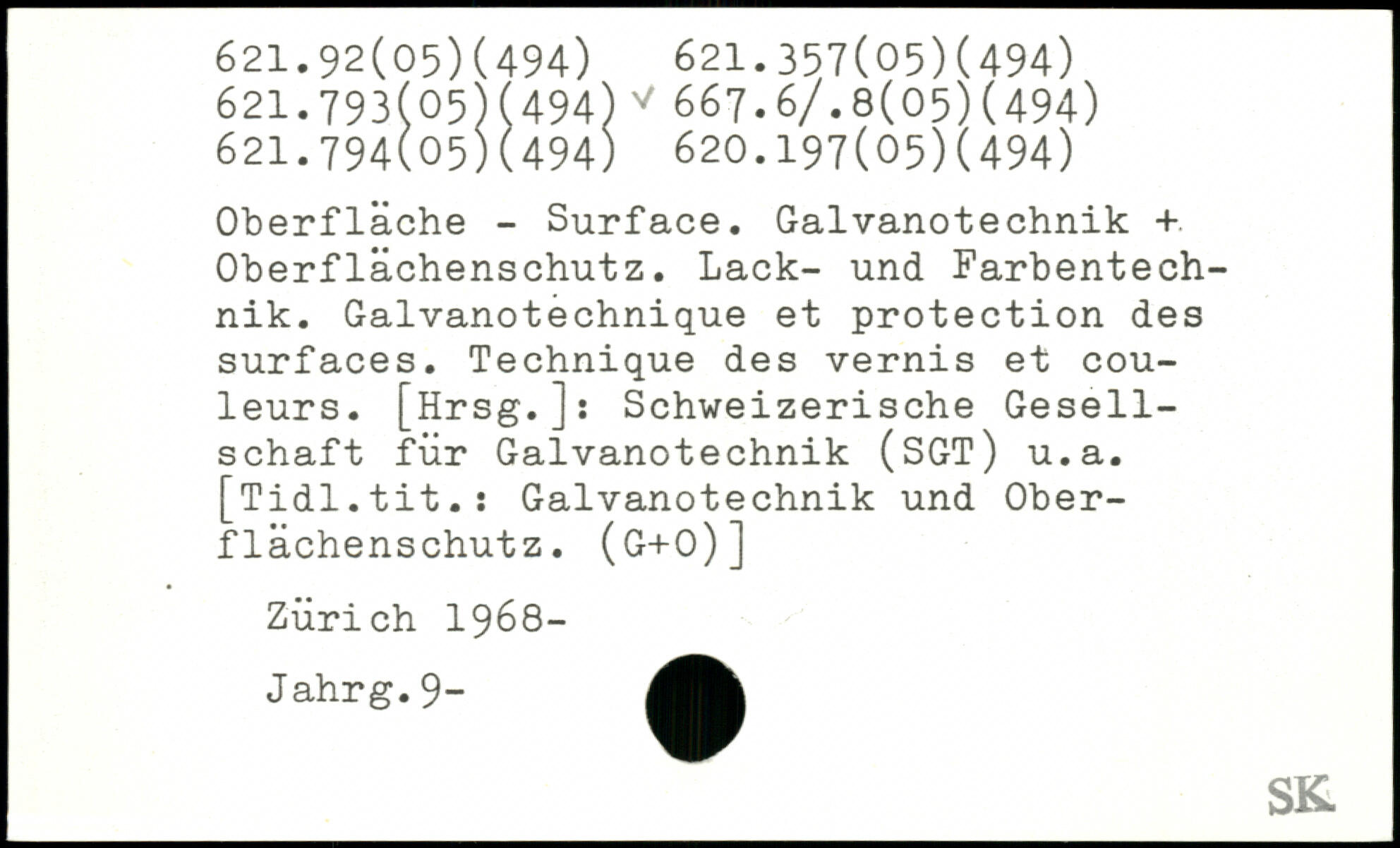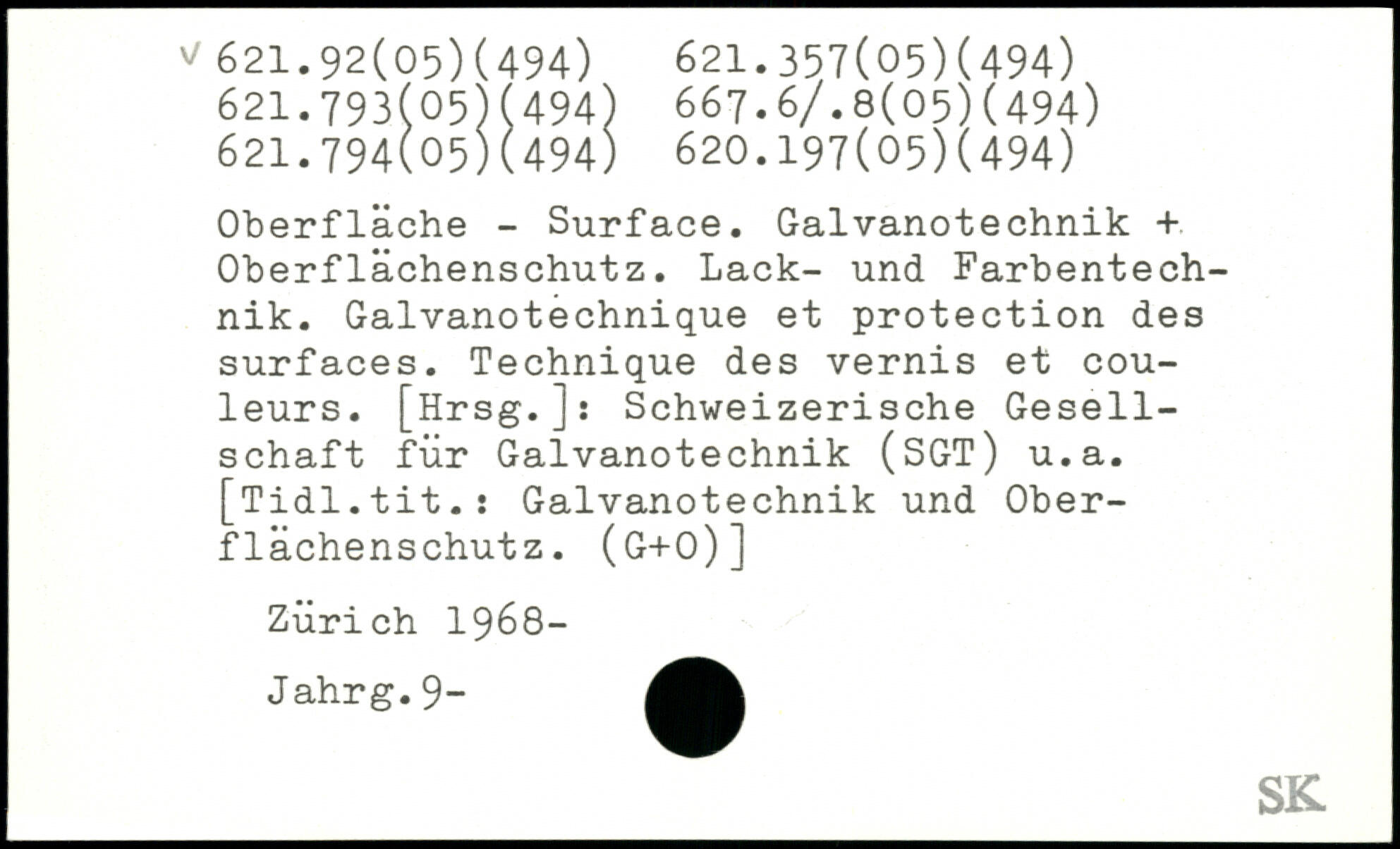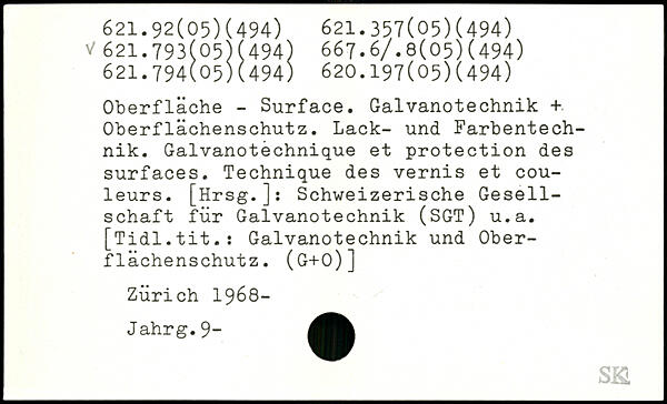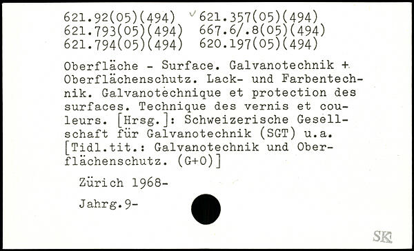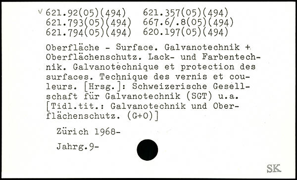 Oberfläche - Surface. Galvanotechnik + Oberflächenschutz. Lack- und Farbentechnik. Galvanotechnique et protection des surfaces. Technique des vernis et couleurs. [Hrsg.]: Schweizerische Gesellschaft für Galvanotechnik (SGT) u.a. [Tidl.tit.: Galvanotechnik und Oberflächenschutz. (g+o)] Zürich 1968- Jahrg.9-