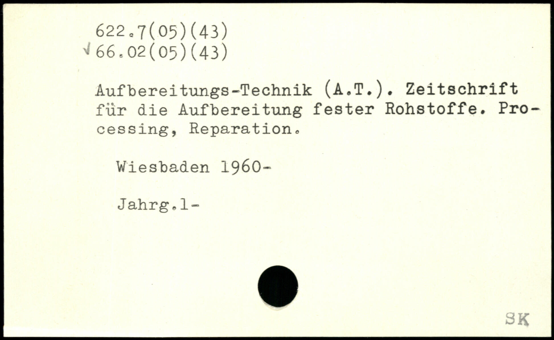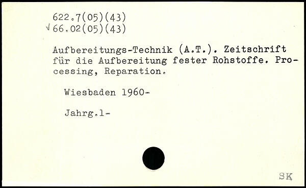 Aufbereitungs-Technik (A.T.). Zeitschrift für die Aufbereitung fester Rohstoffe. Processing, Reparation,, Wiesbaden 1960- Jahrg,, 1-