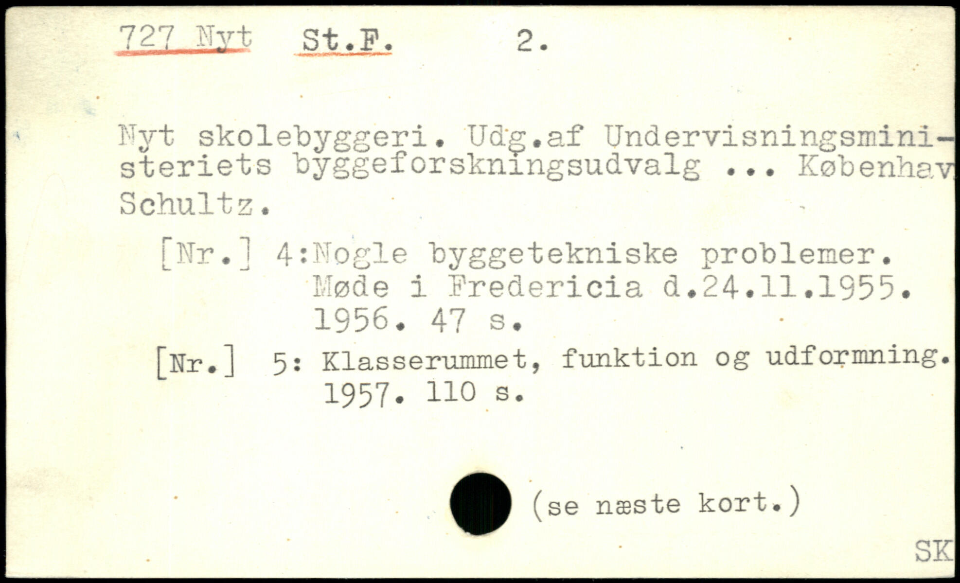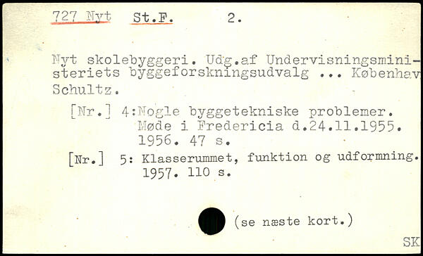 Nyt skolebyggeri. Ud'g.af Undervisningsministeriets byggeforskningsudvalg ... Københav Schultz. [Nr.] 4:Nogle byggetekniske problemer. Møde i Fredericia d.24.11.1955. 1956.