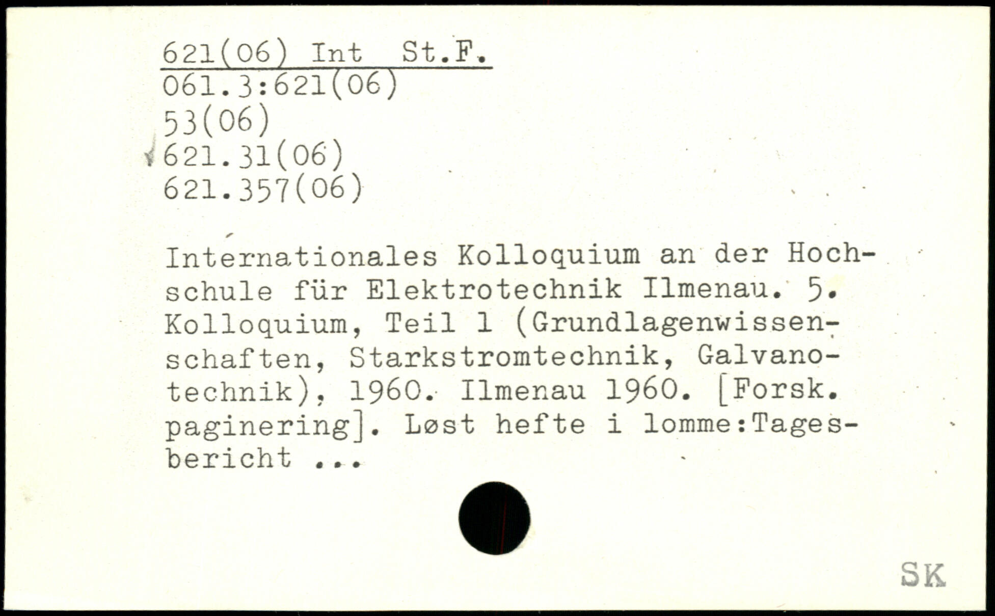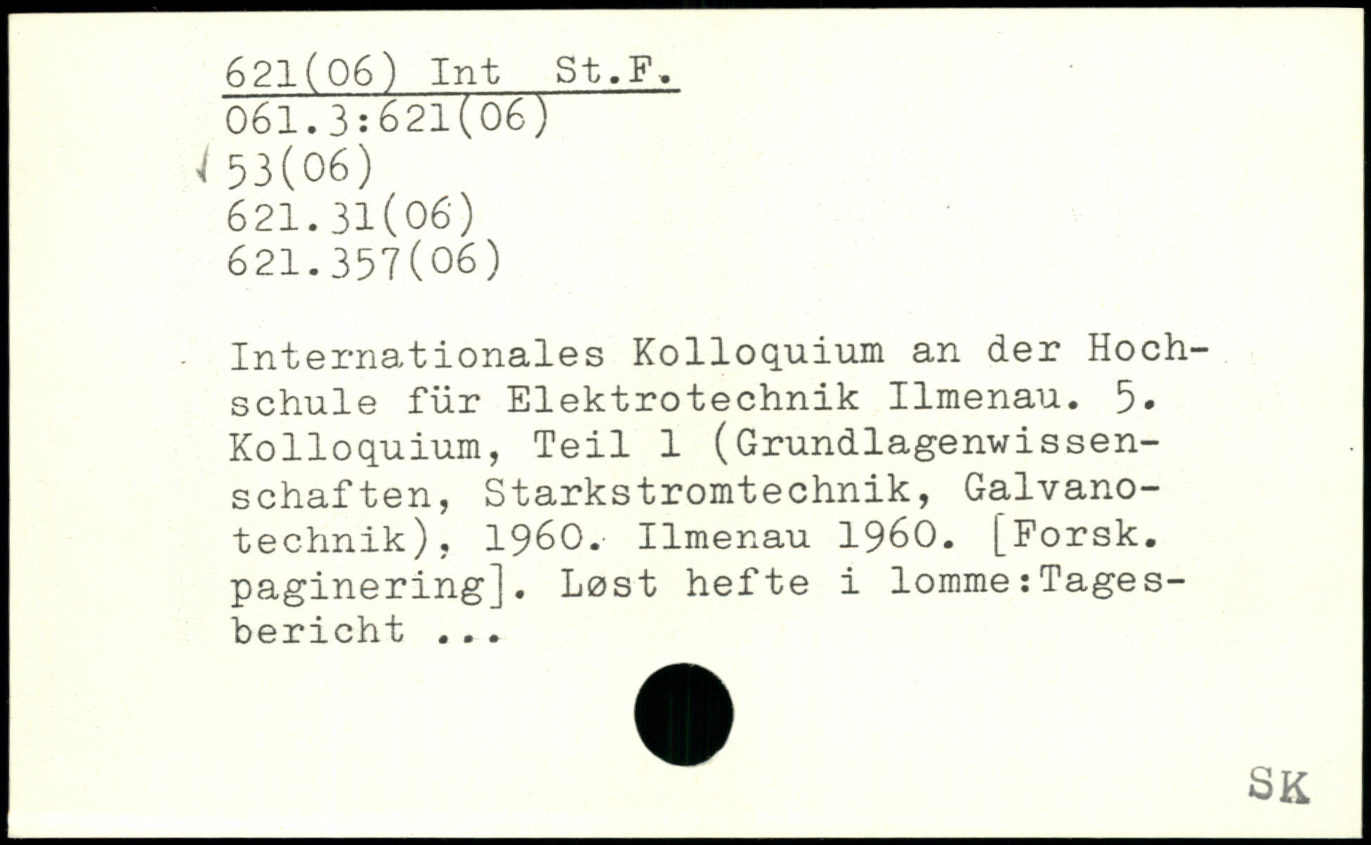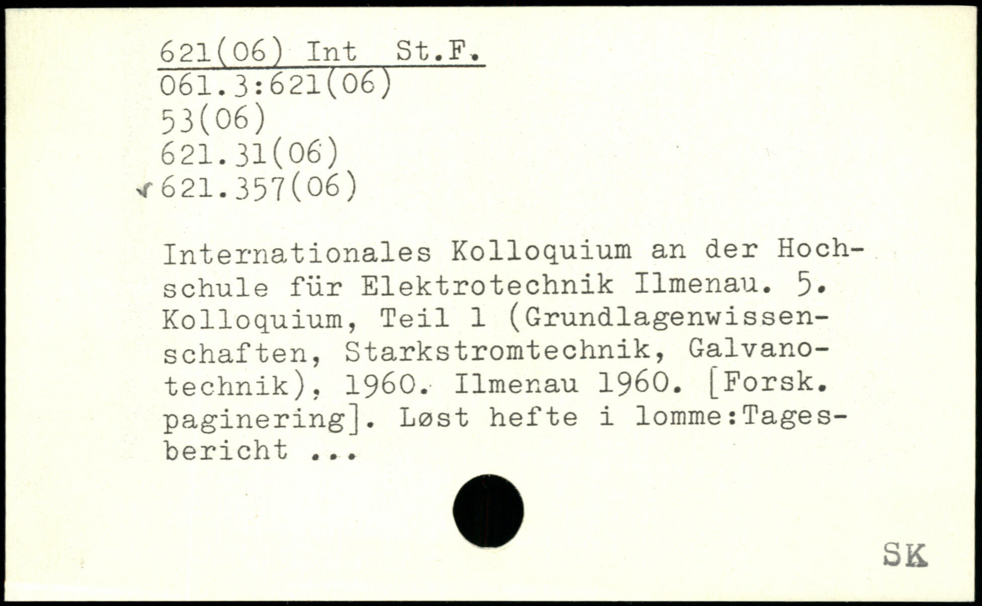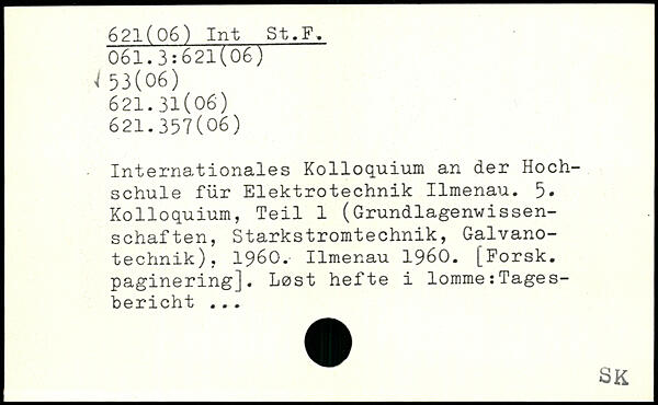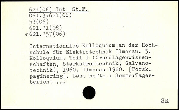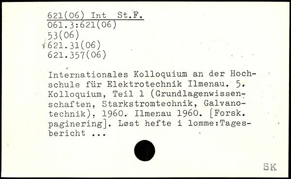 Internationales Kolloquium an der Hochschule für Elektrotechnik Ilmenau. 5. Kolloquium, Teil 1 (Grundlagenwissenschaften, Starkstromtechnik, Galvanotechnik), 1960. Ilmenau 1960. [Forsk. paginering]. Lost hefte i lomme:Tagesbericht. ..