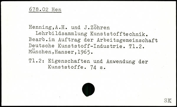 Henning,A.H. und J.ZÖhren Lehrbildsammlung Kuns tstoffte chnik. Bearb.im Auftrag der Arbeitsgemeinschaft Deutsche Kunststoff-Industrie. TI.2.
