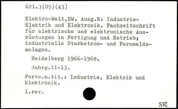 Elektro-Velt,EW. Ausg.B: Industrie-Elektrik und Elektronik, Fachzeitschrift für elektrische und elektronische Ausrüstungen in Fertigung und Eetriebj industrielle Starkstrom- und Fernmeldeanlagen. Heidelberg 1966-1968. Jahrg.II-I3. Forts.m.tit.: Industrie, Elektrik und j Elektronik. _SKI