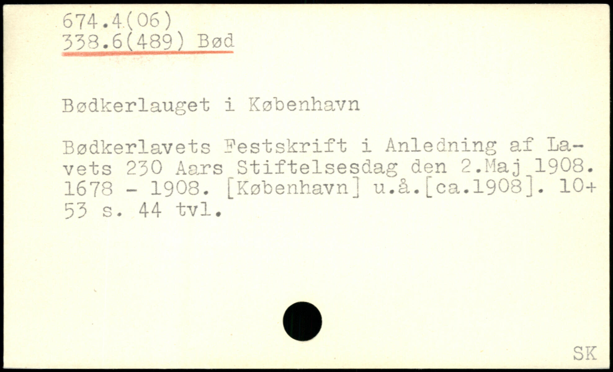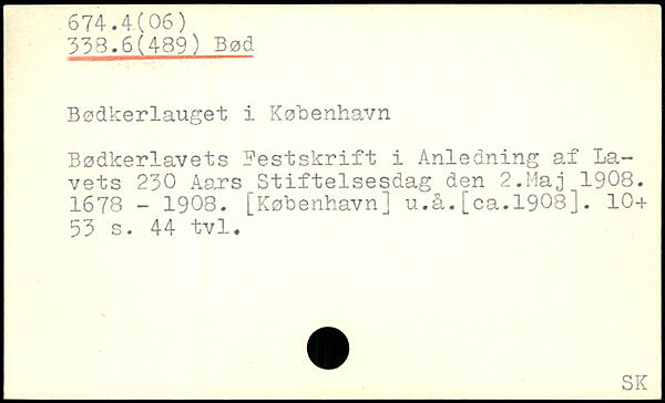 Bødkerlavets Festskrift i Anledning af Lavets 230 Aars Stiftelsesdag den 2.Maj 1908. 1678 - 1908. [København] u.å.[ca.1908]. 10+