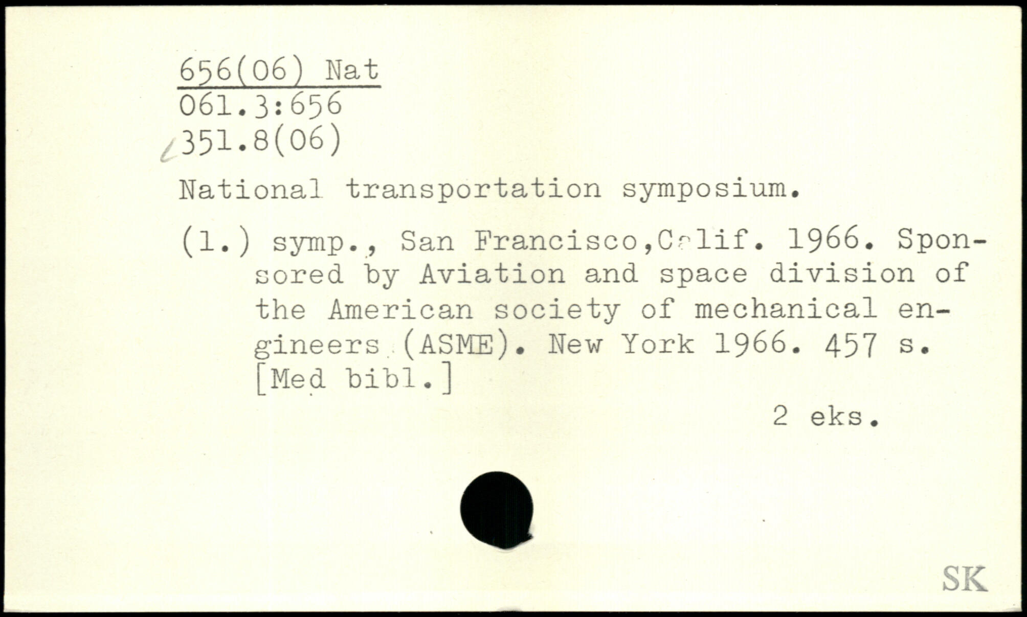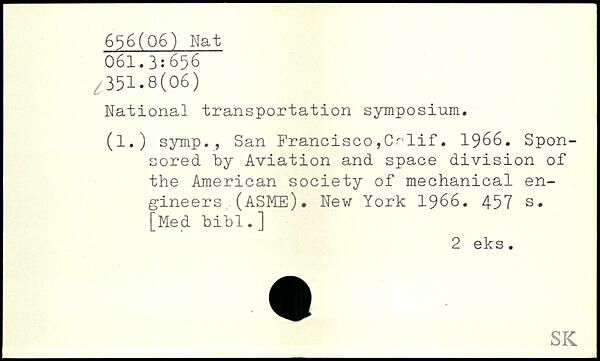National transportation symposium. (l.) symp., San Francisco,Crlif. 1966. Sponsored by Aviation and space division of the American society of mechanical engineers (ASME).