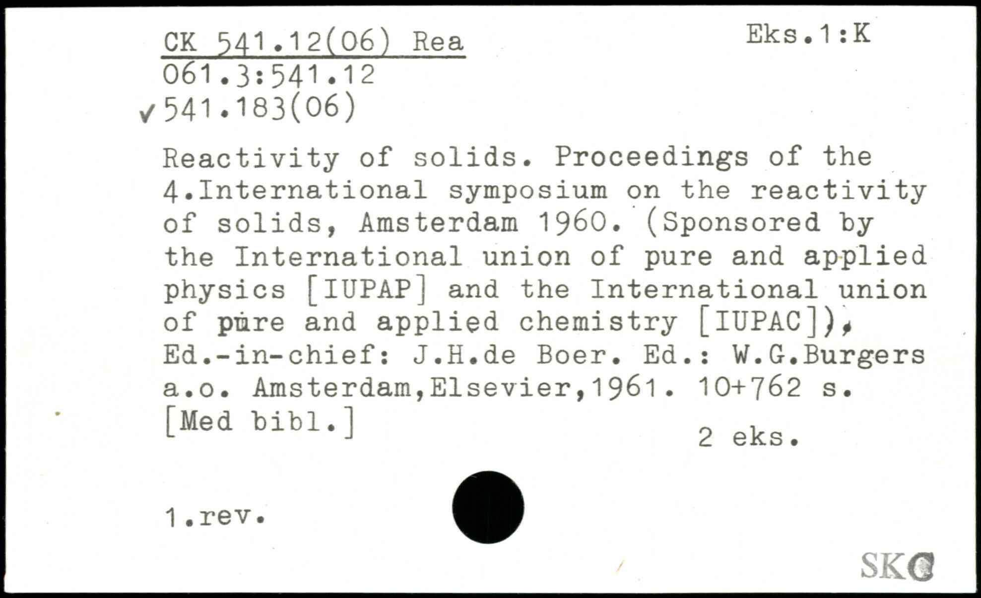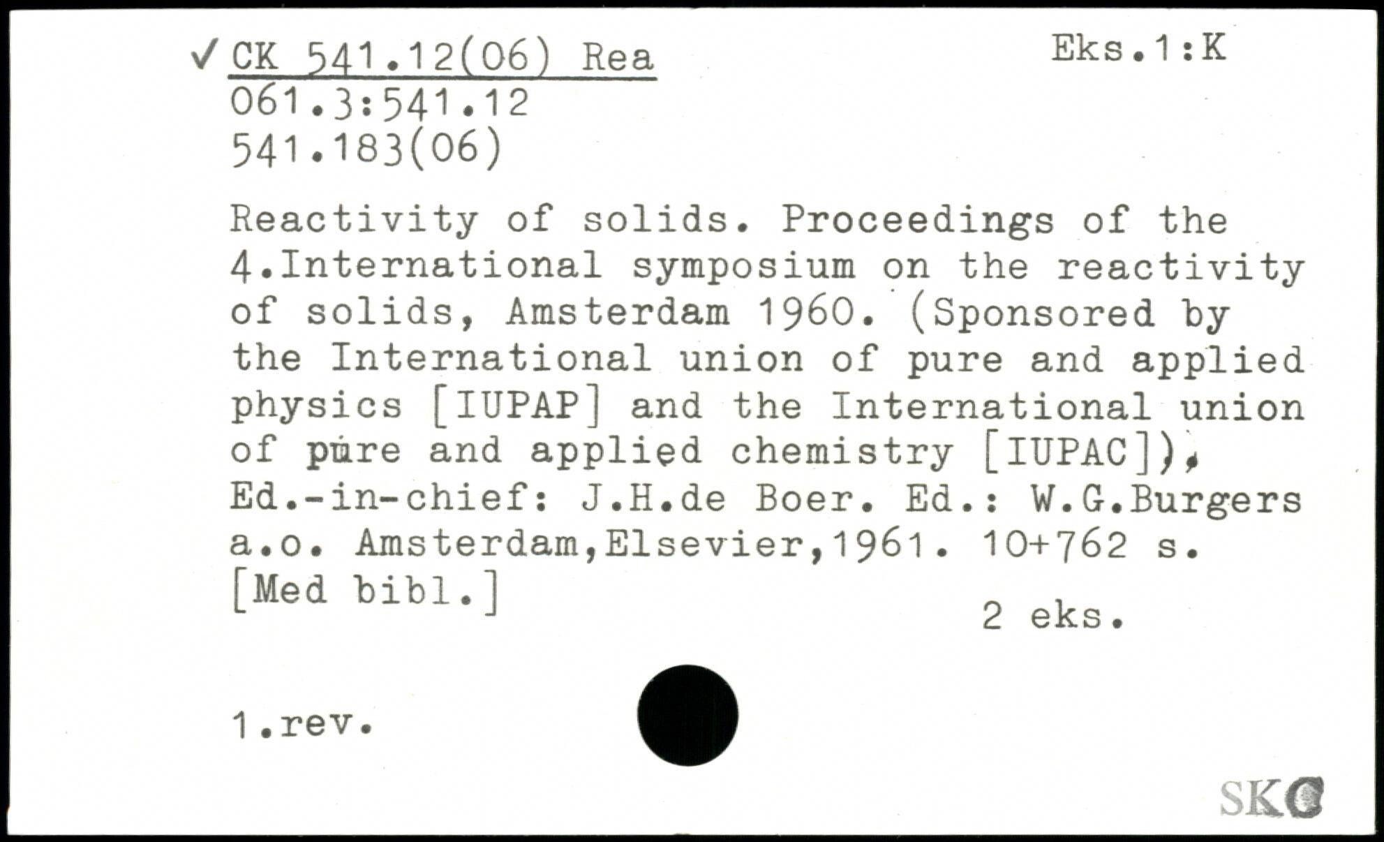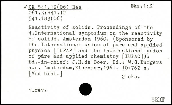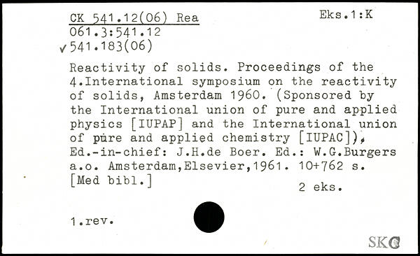 Reactivity of solids. Proceedings of the 4.International symposium on the reactivity of solids, Amsterdam 1960. (Sponsored hy the International union of pure and applied physics [IUPAP] and the International union of pure and applied chemistry [lUPAC]). Ed.-in-chief: J.H.de Boer. Ed.: W.G.Burgers a.o.