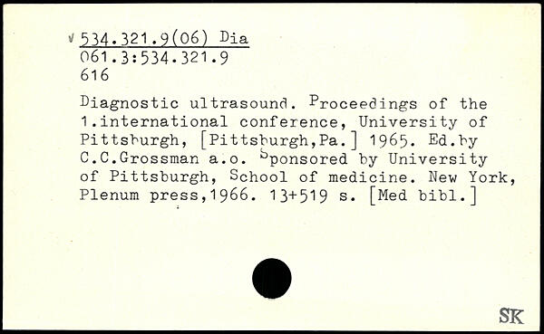 Diagnostic ultrasound. Proceedings of the 1.international conference, University of Pittsburgh, [Pittsburgh,Pa.] 1965- Bd.by C.C.Grossman a.o. Sponsored, by University of Pittsburgh, School of medicine.
