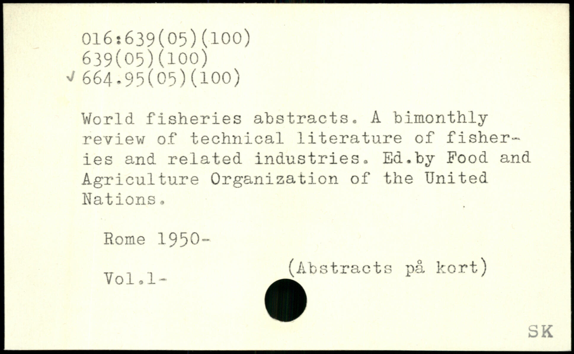 World fisheries abstracts. A bimonthly review of technical literature of fisheries and related industries. Ed.by Food and Agriculture Organization of the United Nations, Rome 1950- TT _ (Abstracts pâ kort)