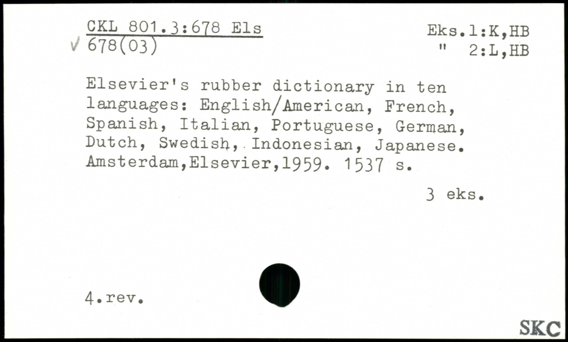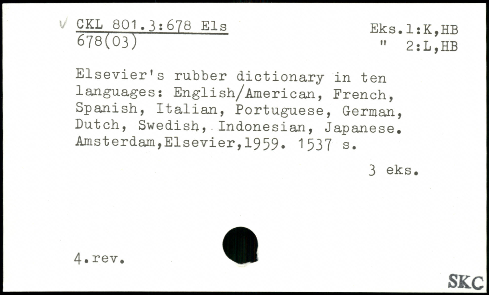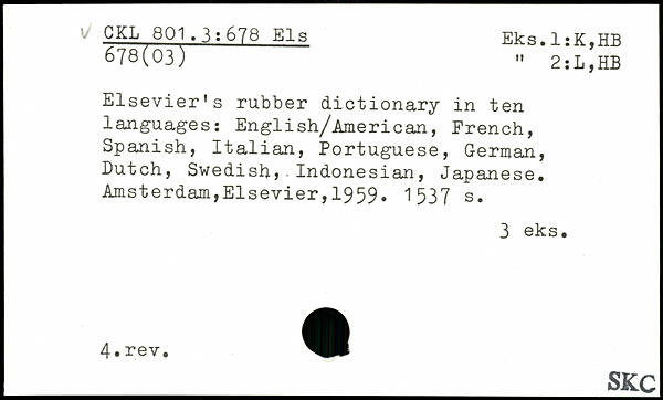 Elsevier’s rubber dictionary in ten languages: English/American, French, Spanish, Italian, Portuguese, German, Butch, Swedish, Indonesian, Japanese.