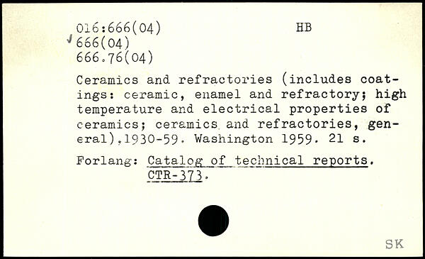 Ceramics and refractories (includes coatings: ceramic, enamel and refractory; high temperature and electrical properties of ceramics; ceramics and refractories, general) , 1930-59.