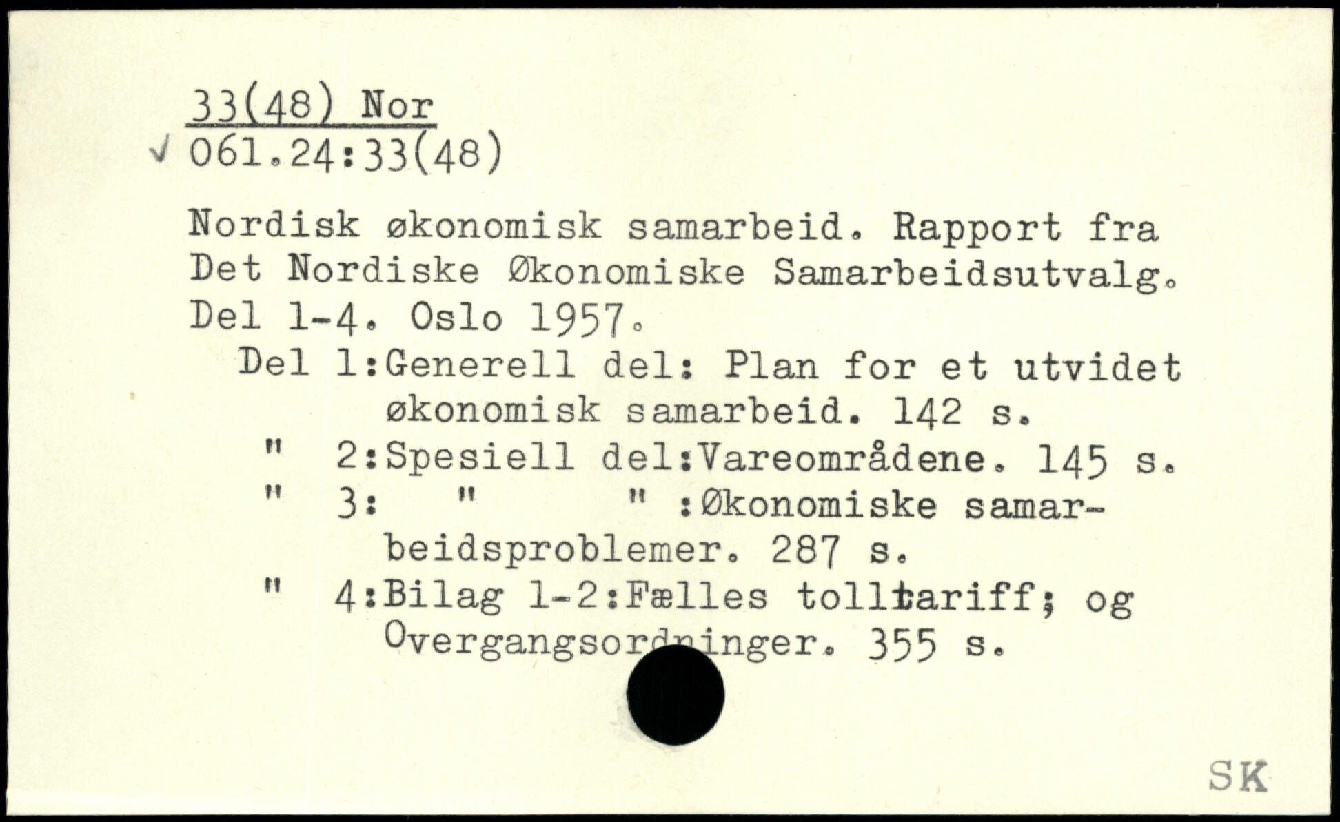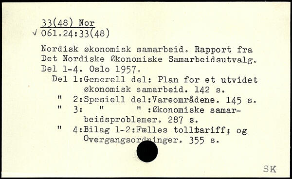 Nordisk økonomisk samarbeid. Rapport fra Det Nordiske Økonomiske Samarbeidsutvalgo Del 1-4. Oslo 1957. Del lsGenerell del: Plan for et utvidet økonomisk samarbeid.