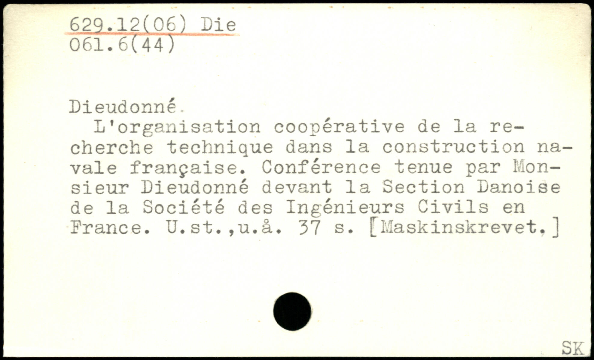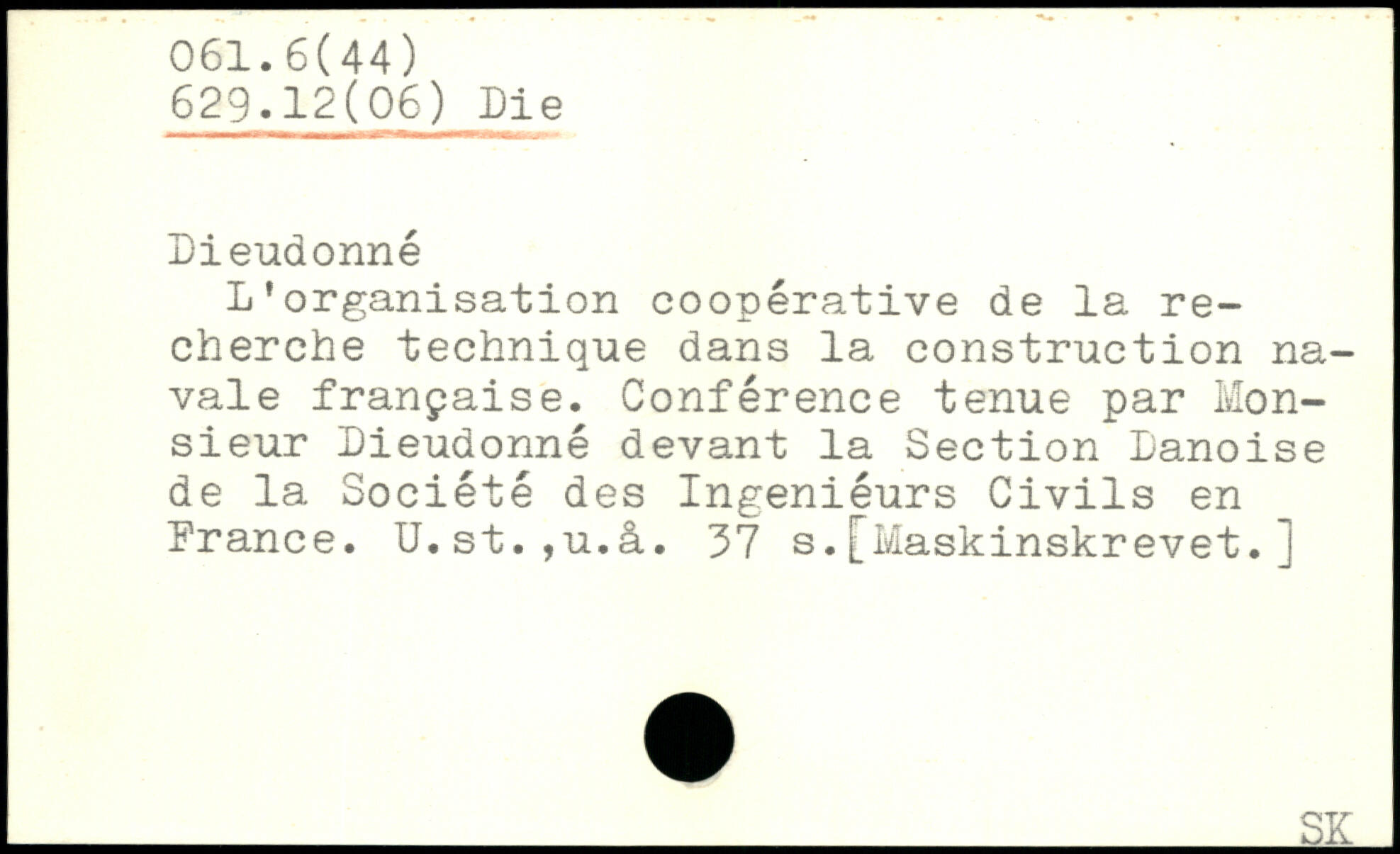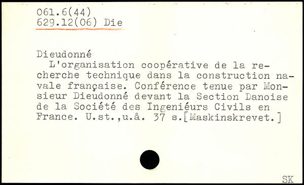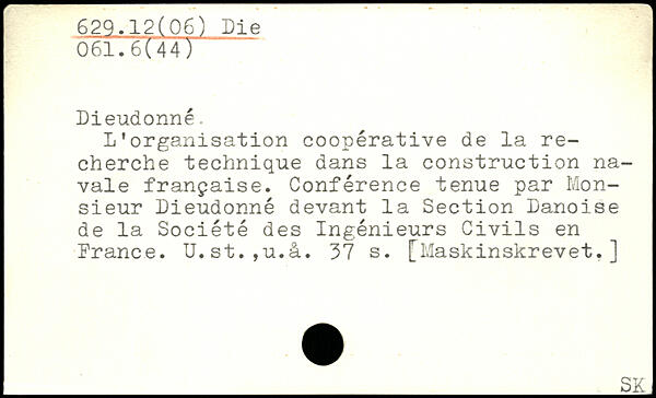L’organisation coopérative de la recherche technique dans la construction navale française. Conférence tenue par Monsieur Dieudonné devant la Section Danoise de la Société des Ingeniéurs Civils en France. U.st.,u.à.