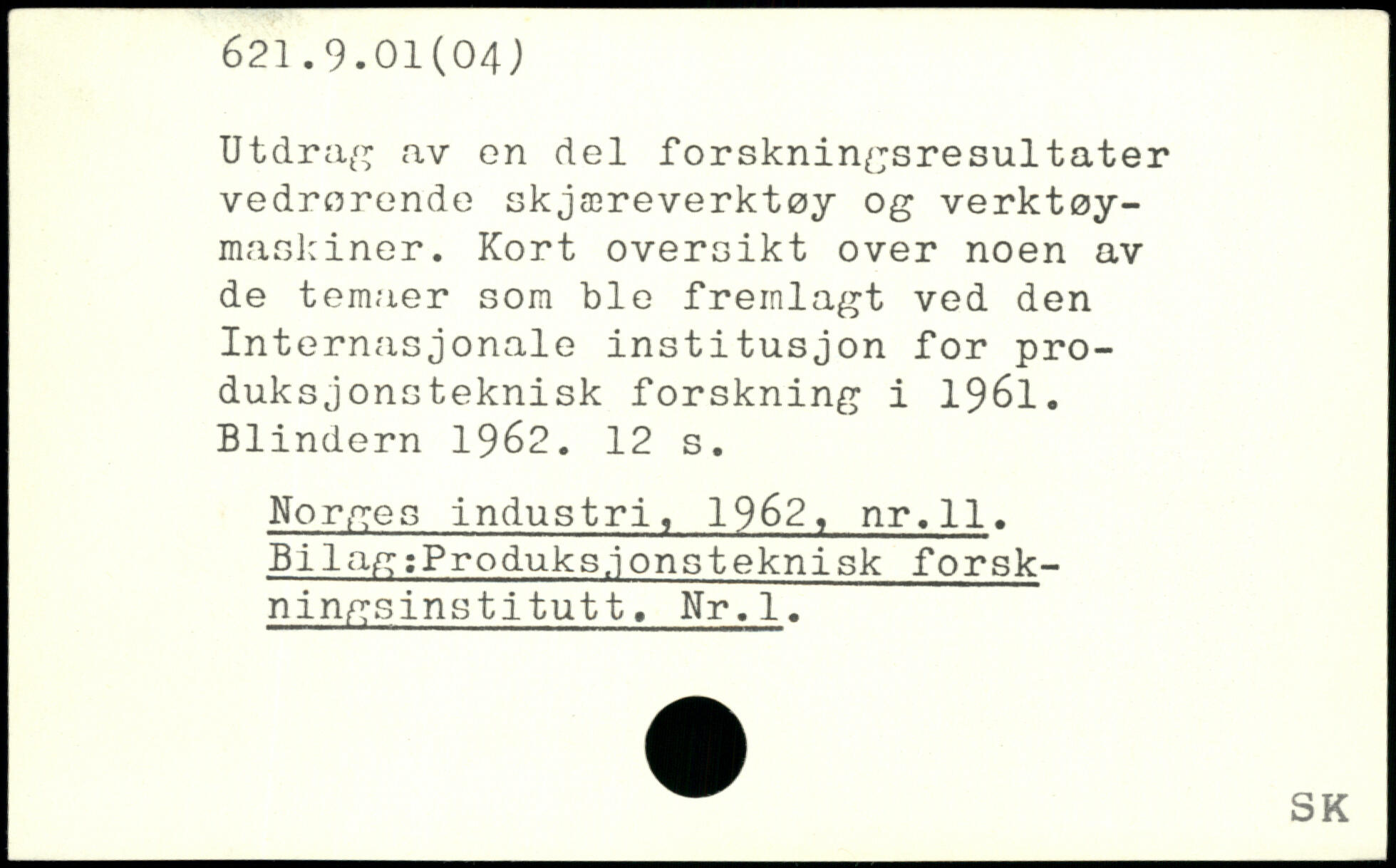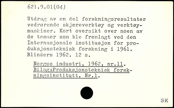 Utdrag av on del forskningsresultater vedrorende skjæreverktøy og verktøy-maskiner. Kort oversikt over noen av de temaer som ble fremlagt ved den Internasjonale institusjon for pro-duksjonsteknisk forskning i 1961. Blindern 1962.