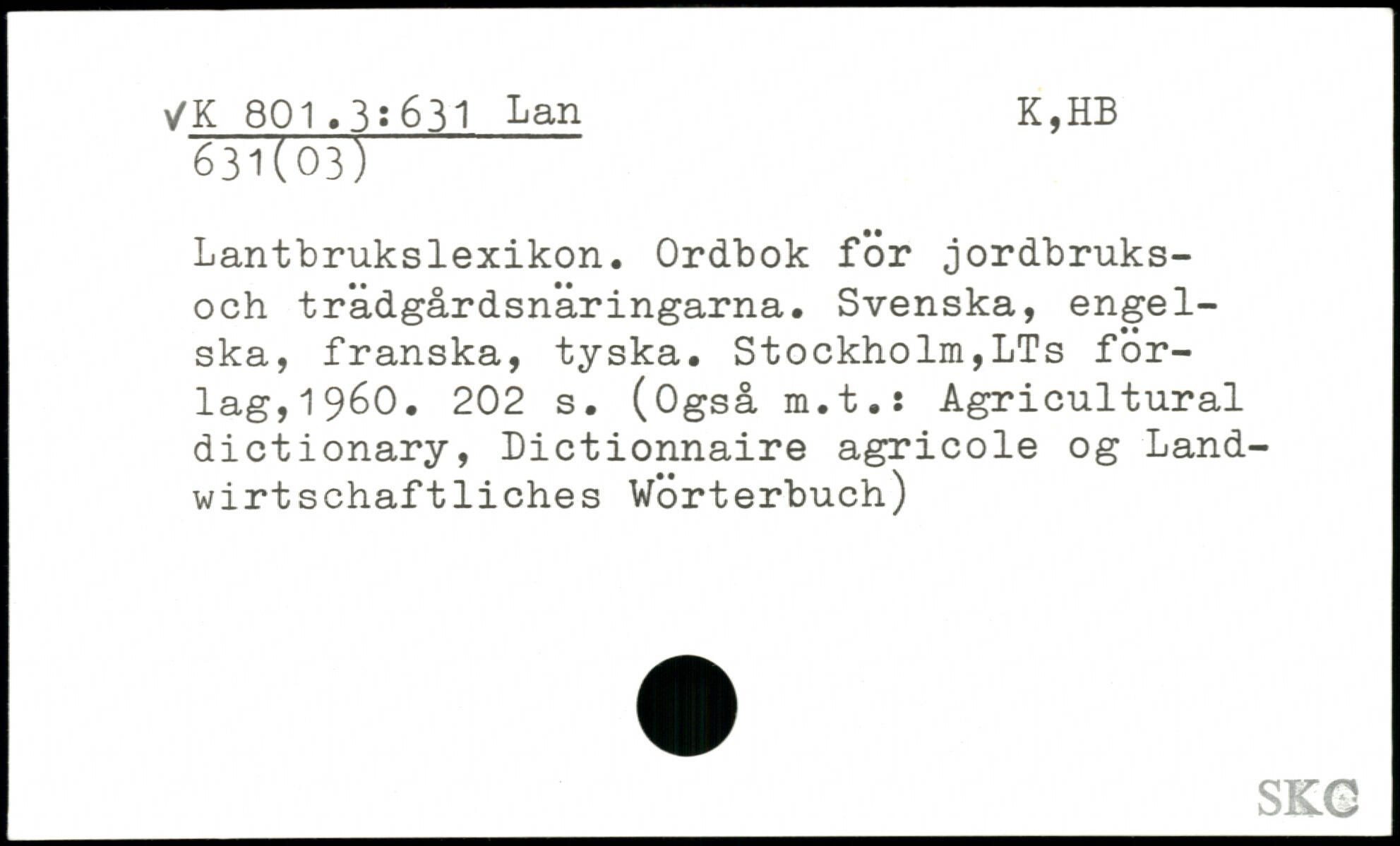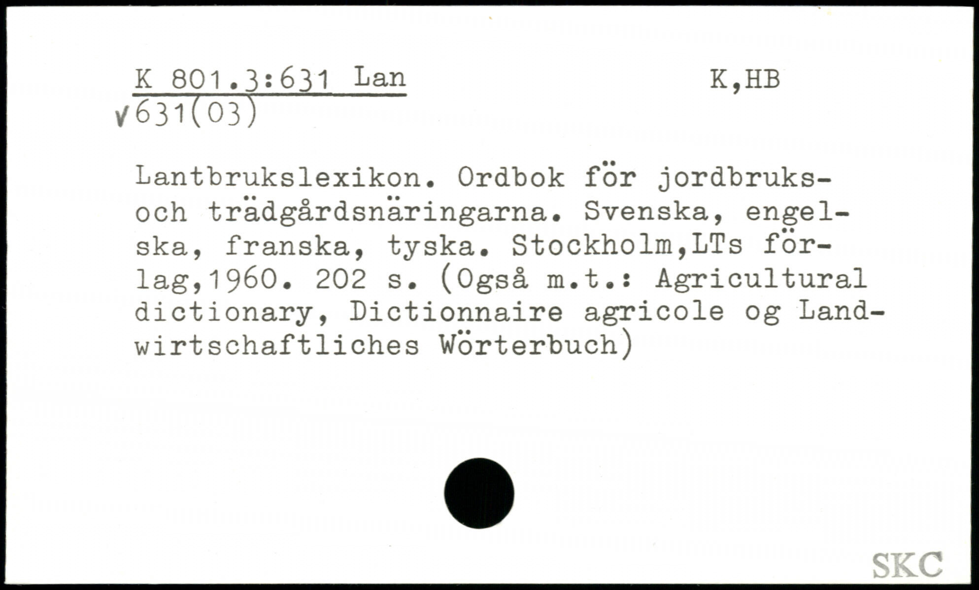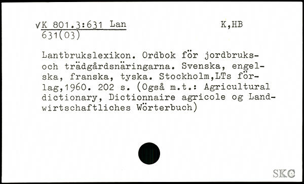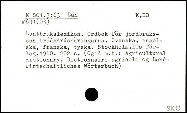 Lantbrukslexikon. Ordbok för jordbruks-och trädgårdsnäringarna. Svenska, engelska, franska, tyska.