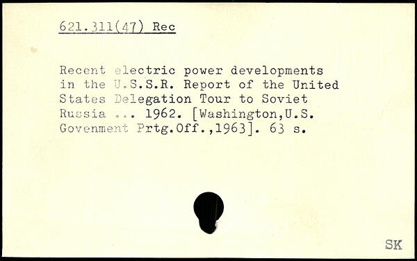 Recent electric power developments in the U.S.S.R. Report of the United States Delegation Tour to Soviet Russia 1962. [Washington,U.S. Govenment Prtg.Off1963].