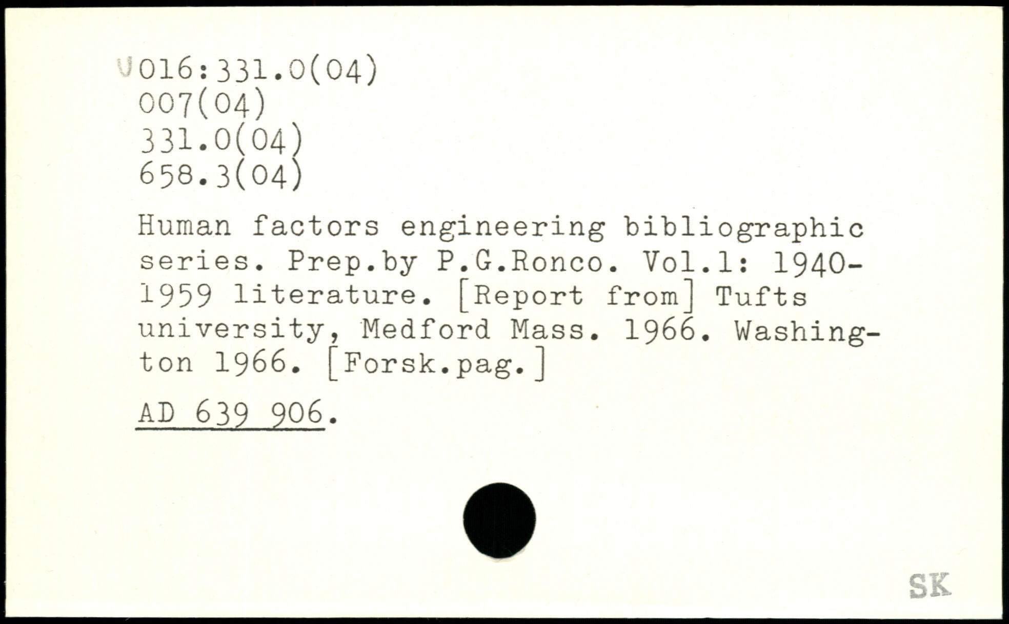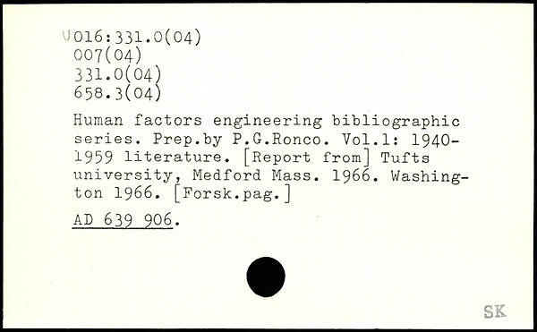 Human factors engineering bibliographic series. Prep.by P.G.Ronco. Vol.l: 1940-1959 literature. [Report from] Tufts university, Medford Mass. 1966.