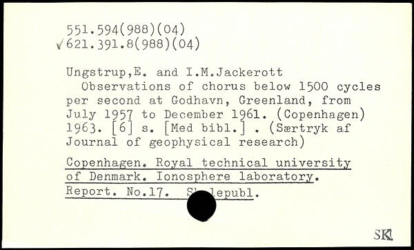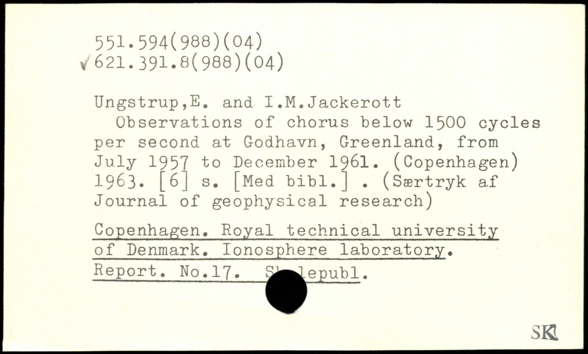 Ungstrup,E. and. I .M. Jackerott Observations of chorus below 1^00 cycles per second at Godhavn, Greenland, from July 1957 to December 1961. (Copenhagen) 1963. [6] s.