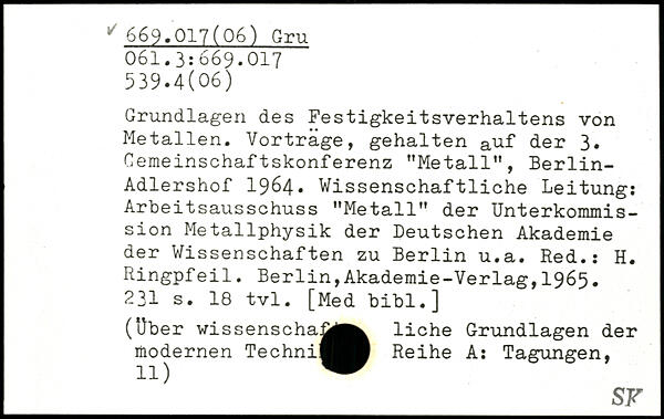 Grundlagen des Festigkeitsverhaltens von Metallen. Vorträge, gehalten auf der 3. Cemeinschaftskonferenz "Metall", Berlin-Adlershof 1964. Wissenschaftliche Leitung: Arbeitsausschuss "Metall" der Unterkommis-sion Metallphysik der Deutschen Akademie der Wissenschaften zu Berlin u.a. Red.: H. Ringpfeil.