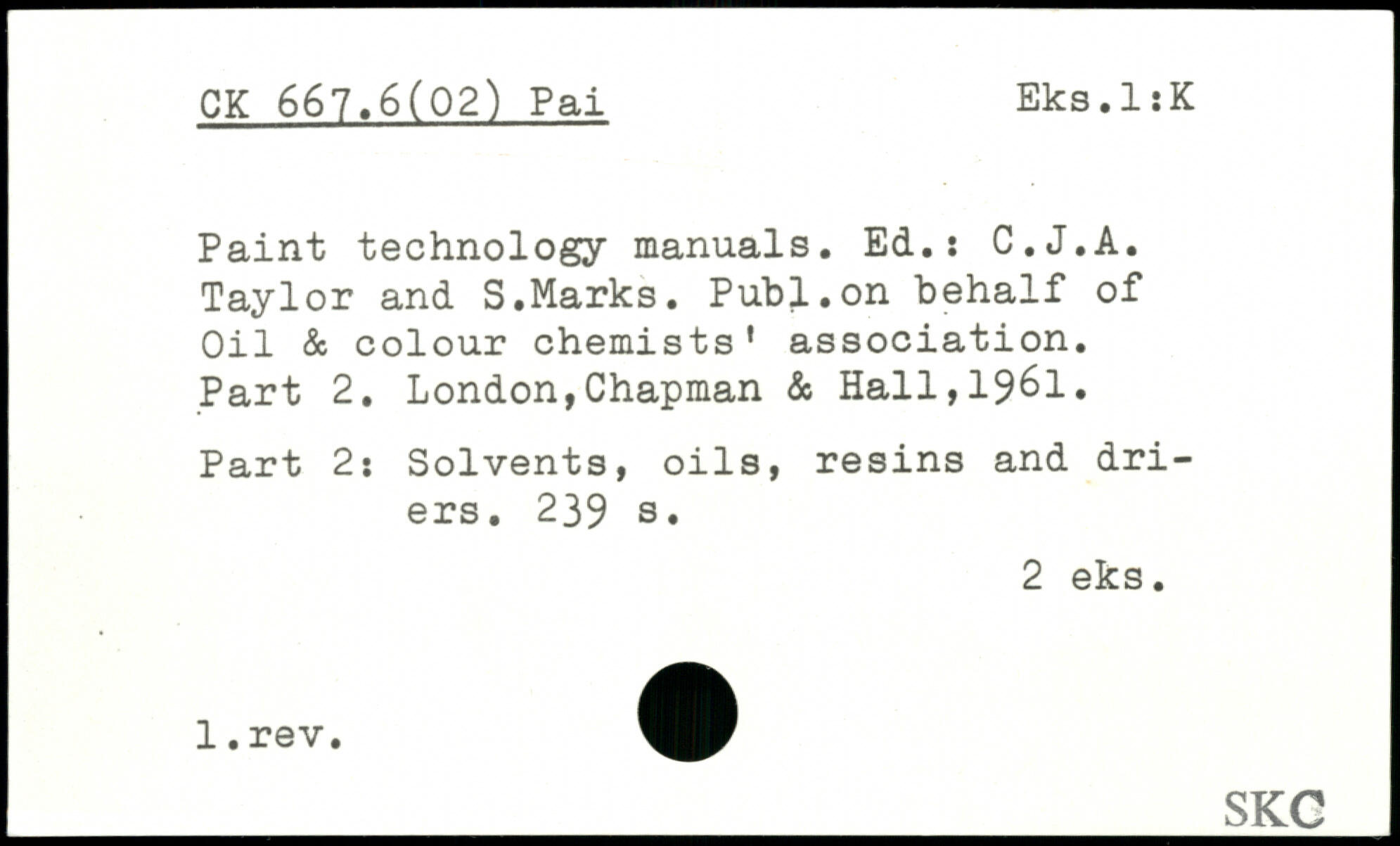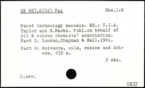 Paint technology manuals. Ed.: C.J.A. Taylor and S.Marks. Publ.on behalf of Oil & colour chemists' association. Part 2. London,Chapman & Hall,19^1. Part 2: Solvents, oils, resins and driers.
