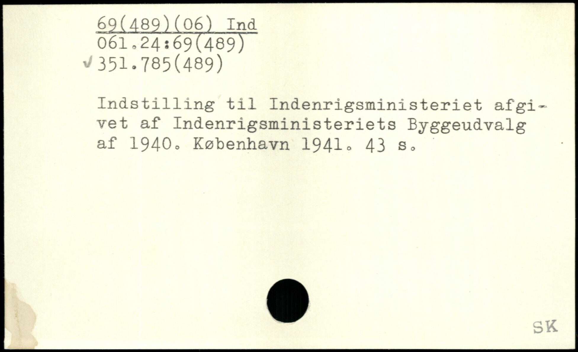 Indst1111ng til Indenrigsministeriet afgivet af Indenrigsministeriets Byggeudvalg af 1940o