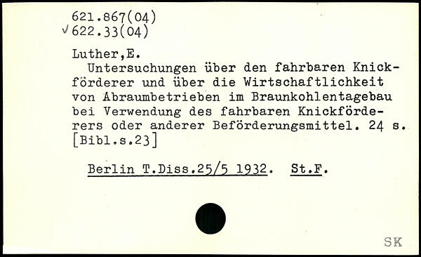 Untersuchungen über den fahrbaren Knickförderer und über die Wirtschaftlichkeit von Abraumbetrieben im Braunkohlentagebau bei Verwendung des fahrbaren Knickförderers oder anderer Beförderungsmittel.